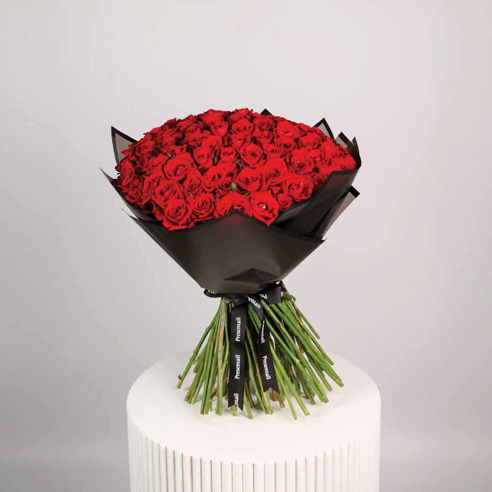 باقة يد تحتوي على 100 زهرة جوري حمراء، مثالية للأعراس، الذكرى السنوية والمناسبات الخاصة.