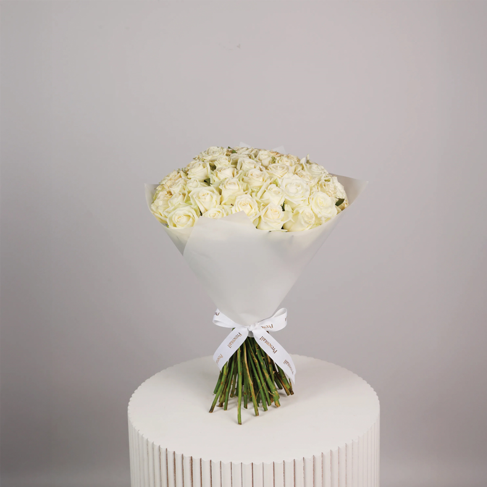 باقة يد تحتوي على 50 زهرة جوري بيضاء، مرتبة بشكل جميل لشخص مميز.