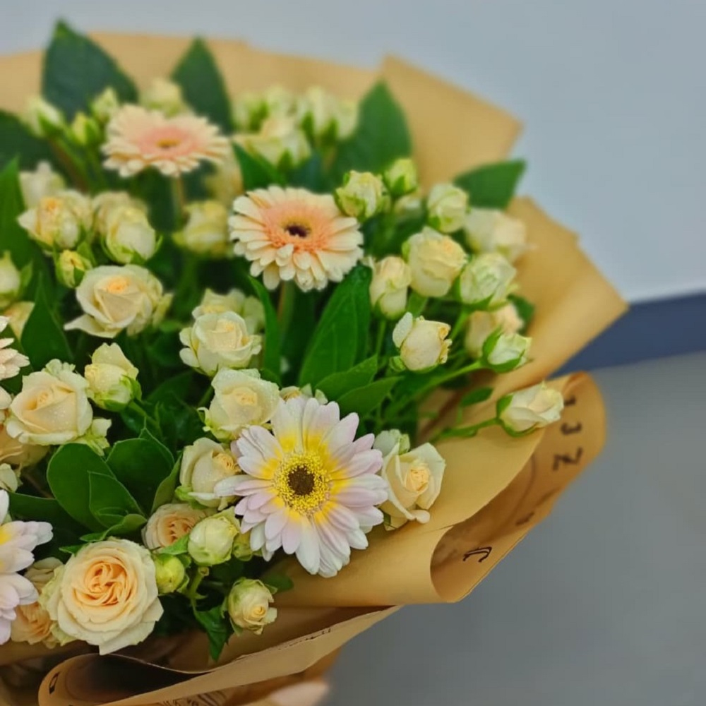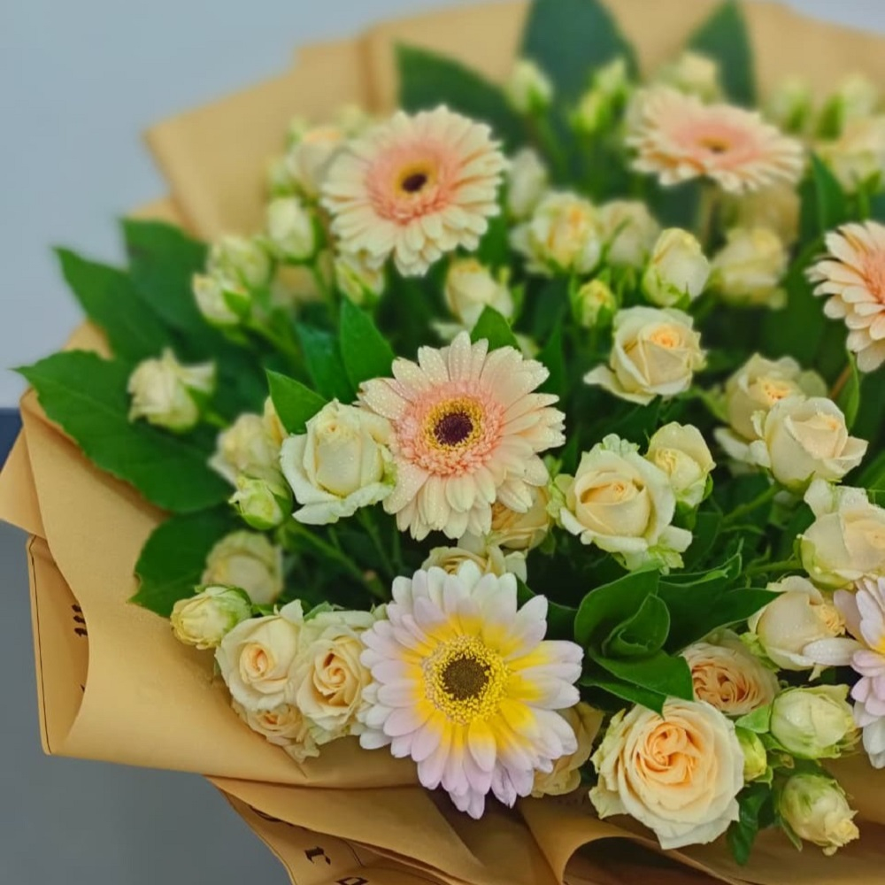 باقة أنيقة بأزهار البيبي روز مع أزهار الجربيرا باللون المشمشي الفاتح، مغلفة بورق بني ريفي ومربوطة بشريطة ساتان بسيطة بتصميم يمنح إطلالة ناعمة وراقية.