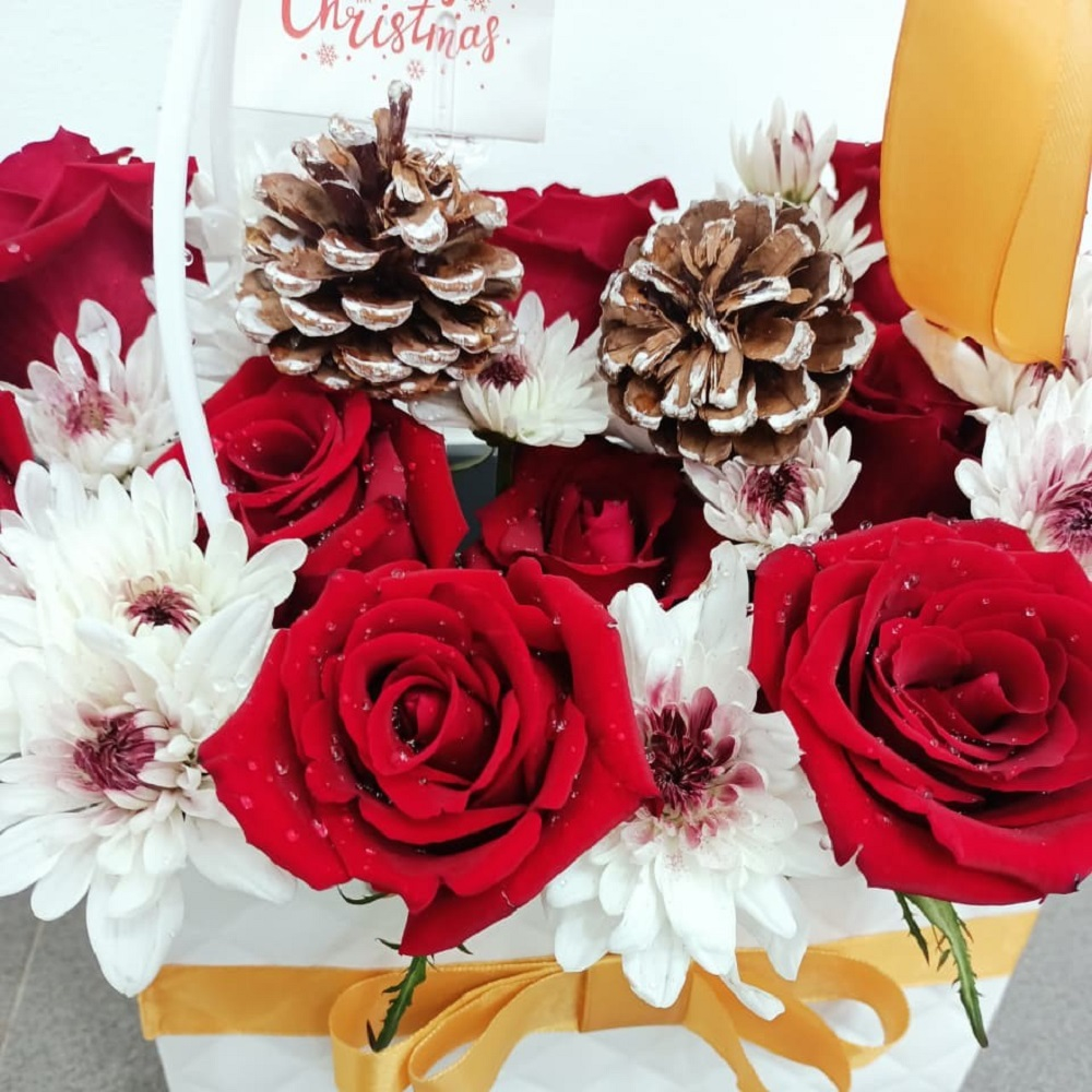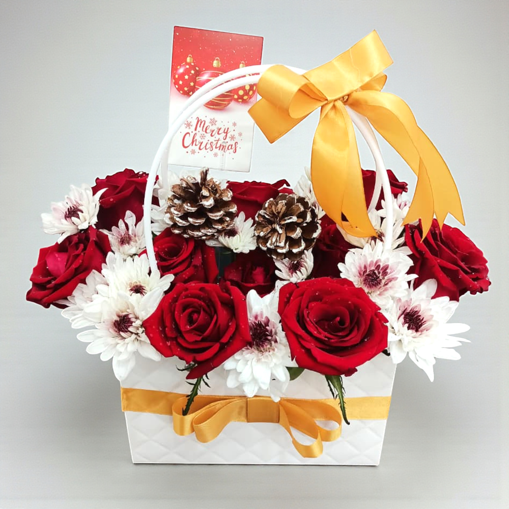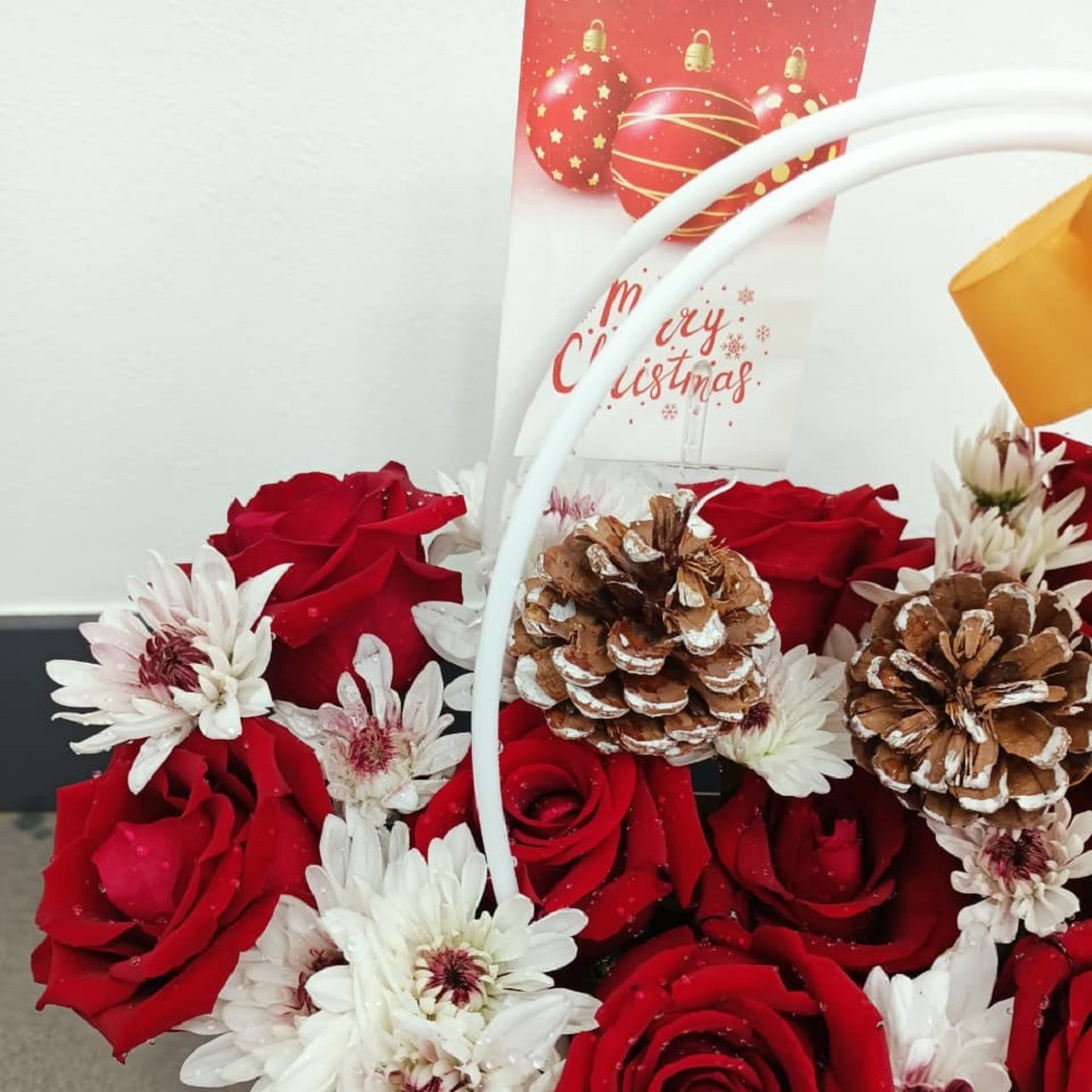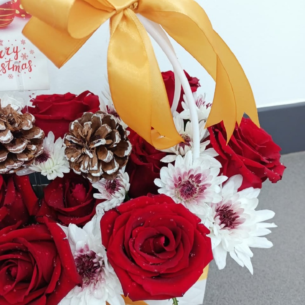 سلة عيد ميلاد ساحرة مليئة بالجوري الحمراء الفاتنة والزهور البيضاء الناعمة، مزينة بأقماع الصنوبر الاحتفالية وشريط ذهبي، مثالية لتقديم الهدايا الأنيقة في العطلات والاحتفالات.