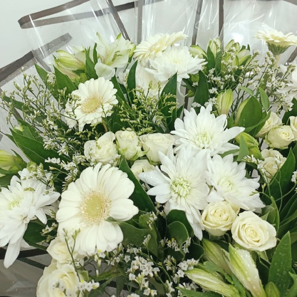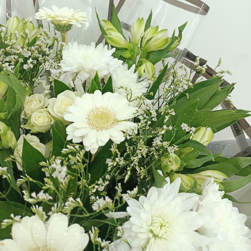 باقة أنيقة بأزهار الجربيرا باللون الأبيض وأزهار الجوري باللون الأبيض وأزهار الكريزانتم باللون الأبيض مع أوراق خضراء غنية رقيقة، مغلفة بتغليف شفاف بحواف داكنة بتصميم يمنح مظهراً فاخراً.