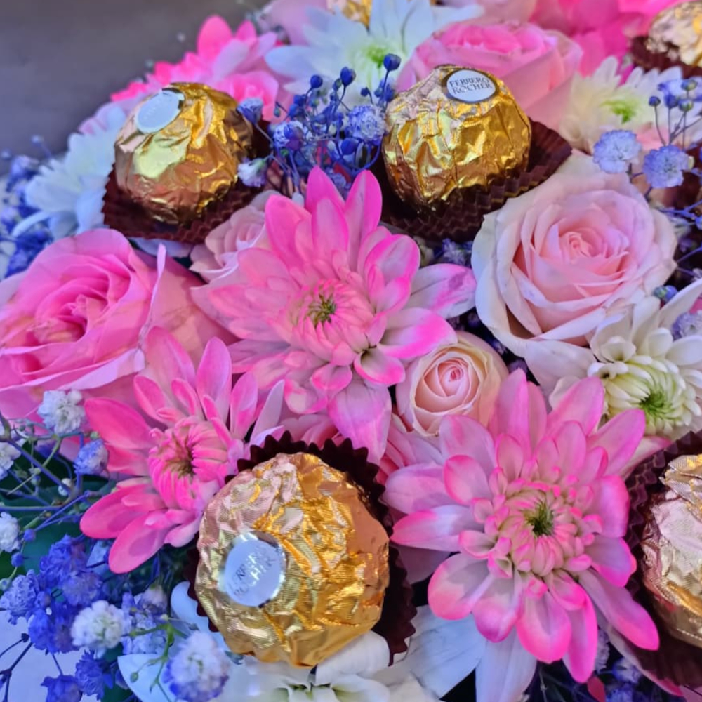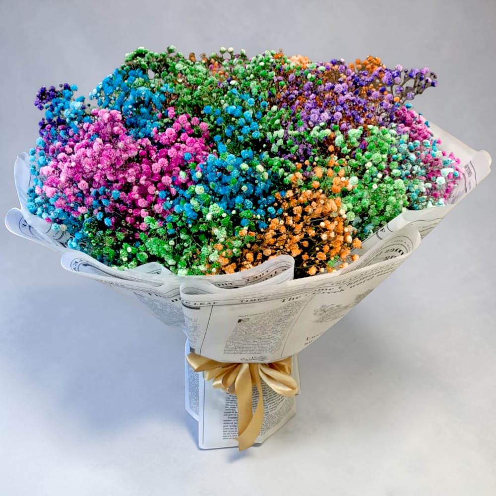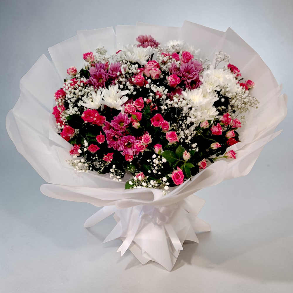 تتميز هذه الباقة الساحرة والزاخرة بمزيج بهيج من الورود الوردية، والأقحوان الأبيض، وزهور الأقحوان الأرجوانية، تتخللها أغصان رقيقة من زهور الجيبسوفيلا البيضاء. تُقدم الباقة في غلاف أبيض متعدد الطبقات بتصميم فني، مما يخلق صورة ظلية ناعمة تشبه السحاب، وتُزين بشريط ساتان أبيض ناصع.