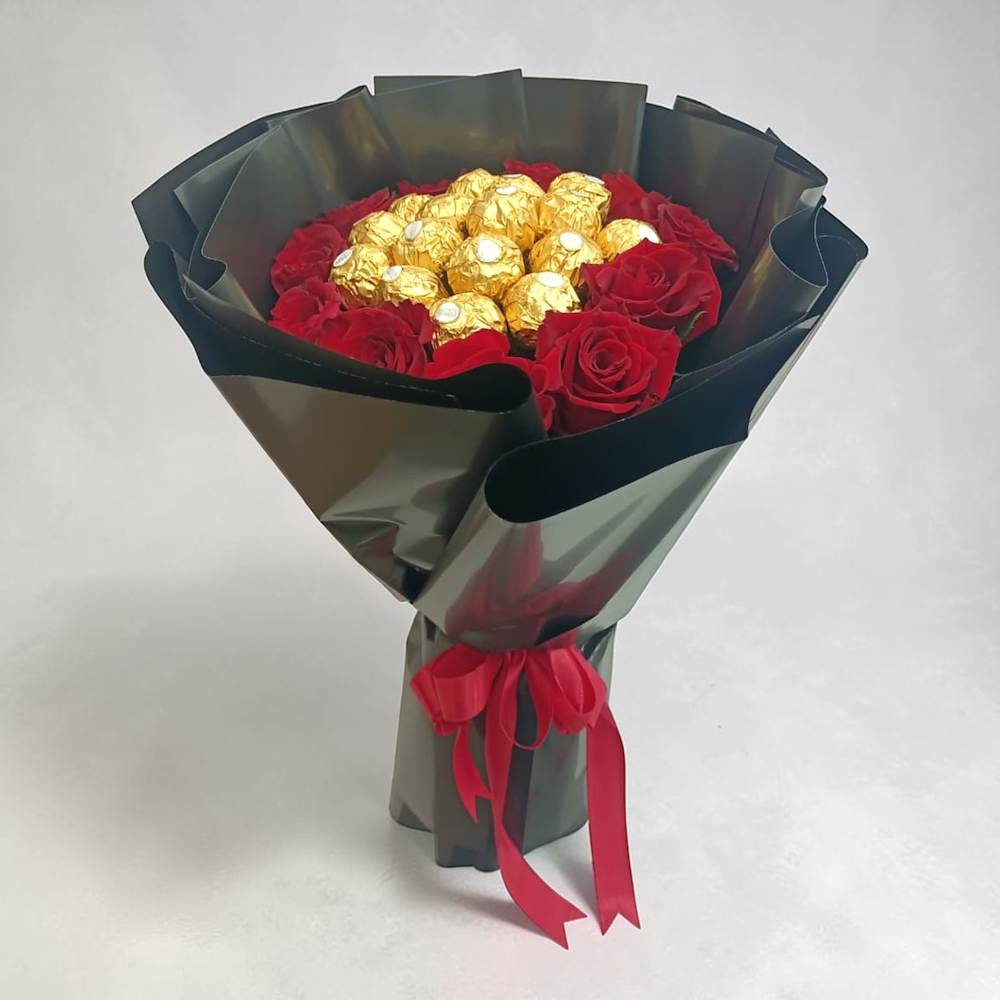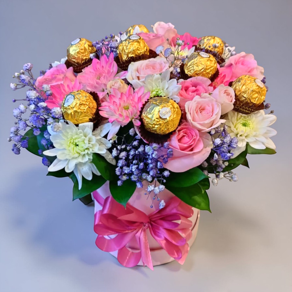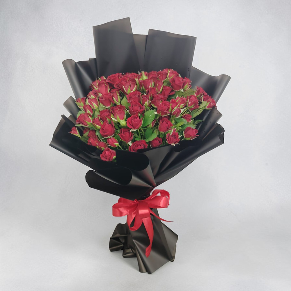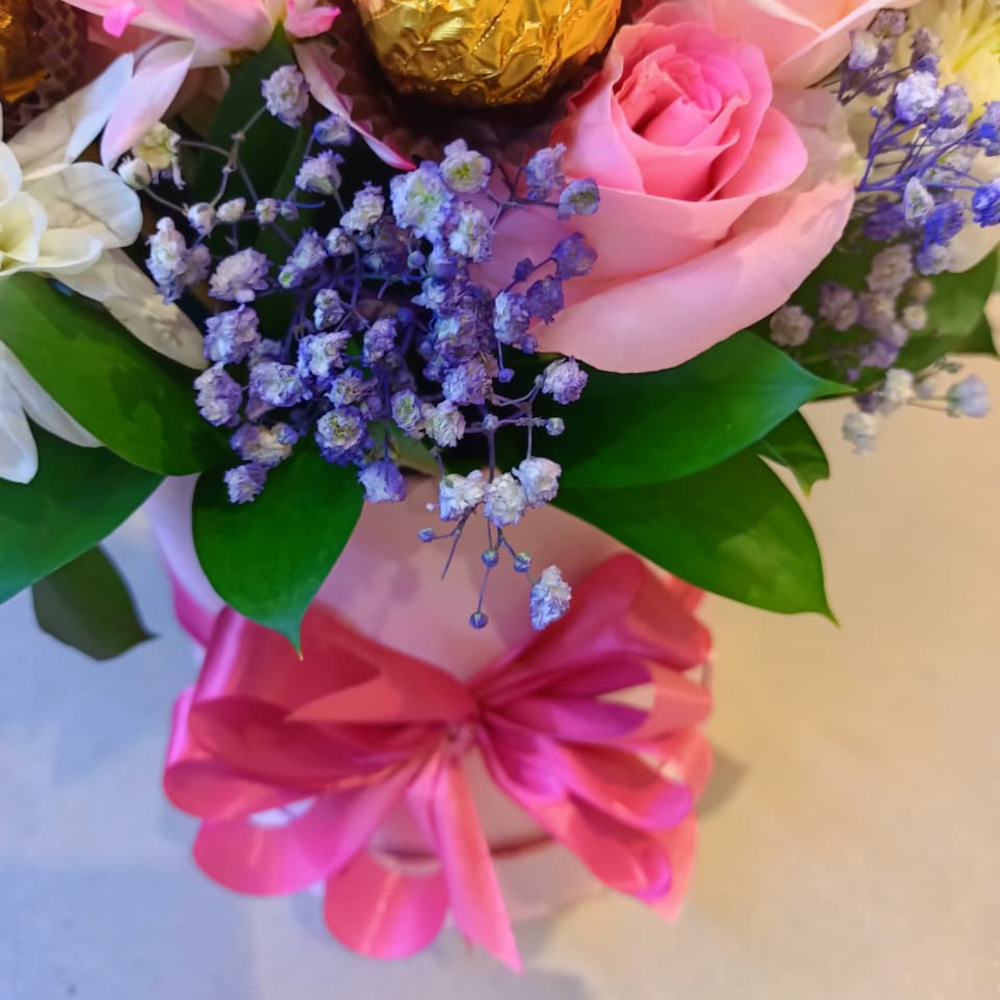 تتميز هذه الباقة الساحرة والزاخرة بمزيج بهيج من الورود الوردية، والأقحوان الأبيض، وزهور الأقحوان الأرجوانية، تتخللها أغصان رقيقة من زهور الجيبسوفيلا البيضاء. تُقدم الباقة في غلاف أبيض متعدد الطبقات بتصميم فني، مما يخلق صورة ظلية ناعمة تشبه السحاب، وتُزين بشريط ساتان أبيض ناصع.