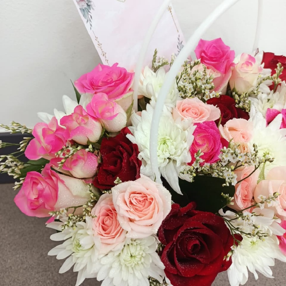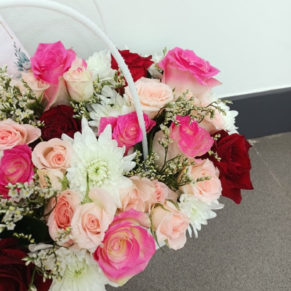باقة زهور فاخرة وغنية، تتألق بتدرج لوني بديع من الجوري الحمراء المخملية الداكنة، والجوري الفوشية الزاهية، وجوري الرش الخوخية الناعمة. تُكمّل هذه الباقة أزهار الأقحوان البيضاء الناصعة وأوراق خضراء رقيقة، وتُقدّم في سلة بيضاء أنيقة مبطنة بمقبض مزدوج، مما يجعلها هدية راقية تُلامس القلب في أي مناسبة.
