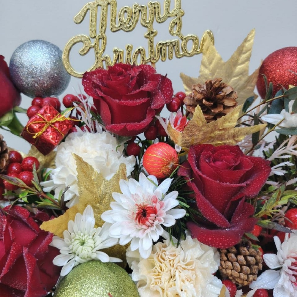 باقة زهور فخمة وإحتفالية مقدمة في فازة أسطوانية ذهبية لامعة. تتميز بمزيج غني من زهور الجوري الحمراء الداكنة، الكارنيشن الأبيض والكريز النجمي الشكل، مزيّة بأوراق ذهبية لامعة، وأقماع صنوبر، وتوت أحمر زاه.
