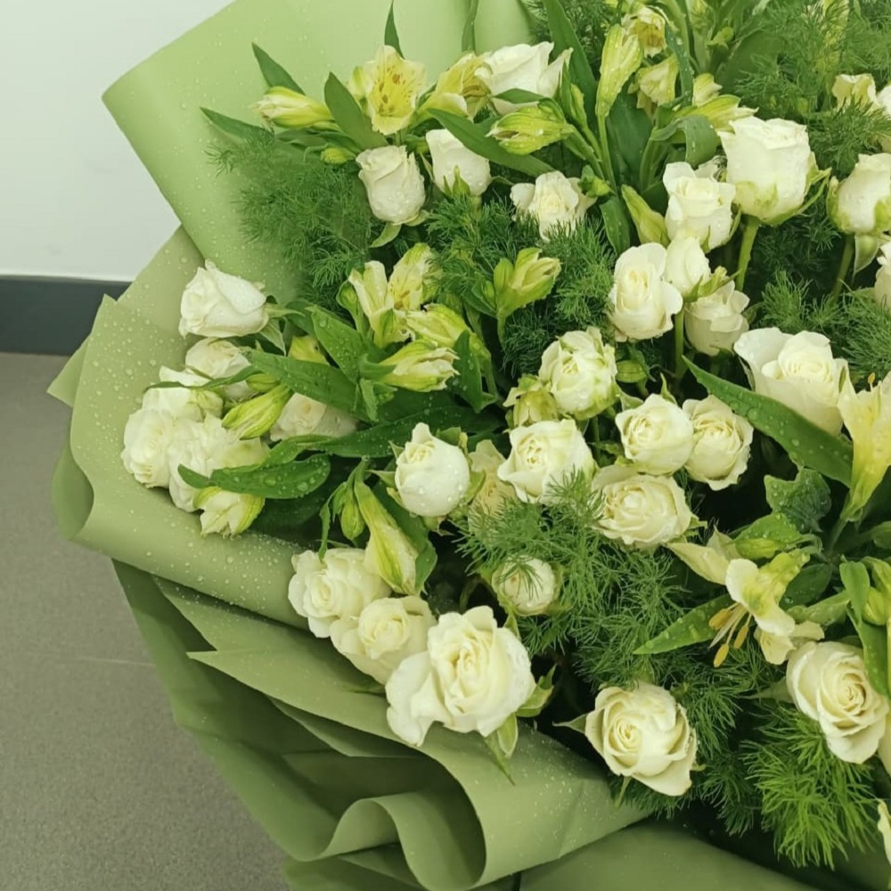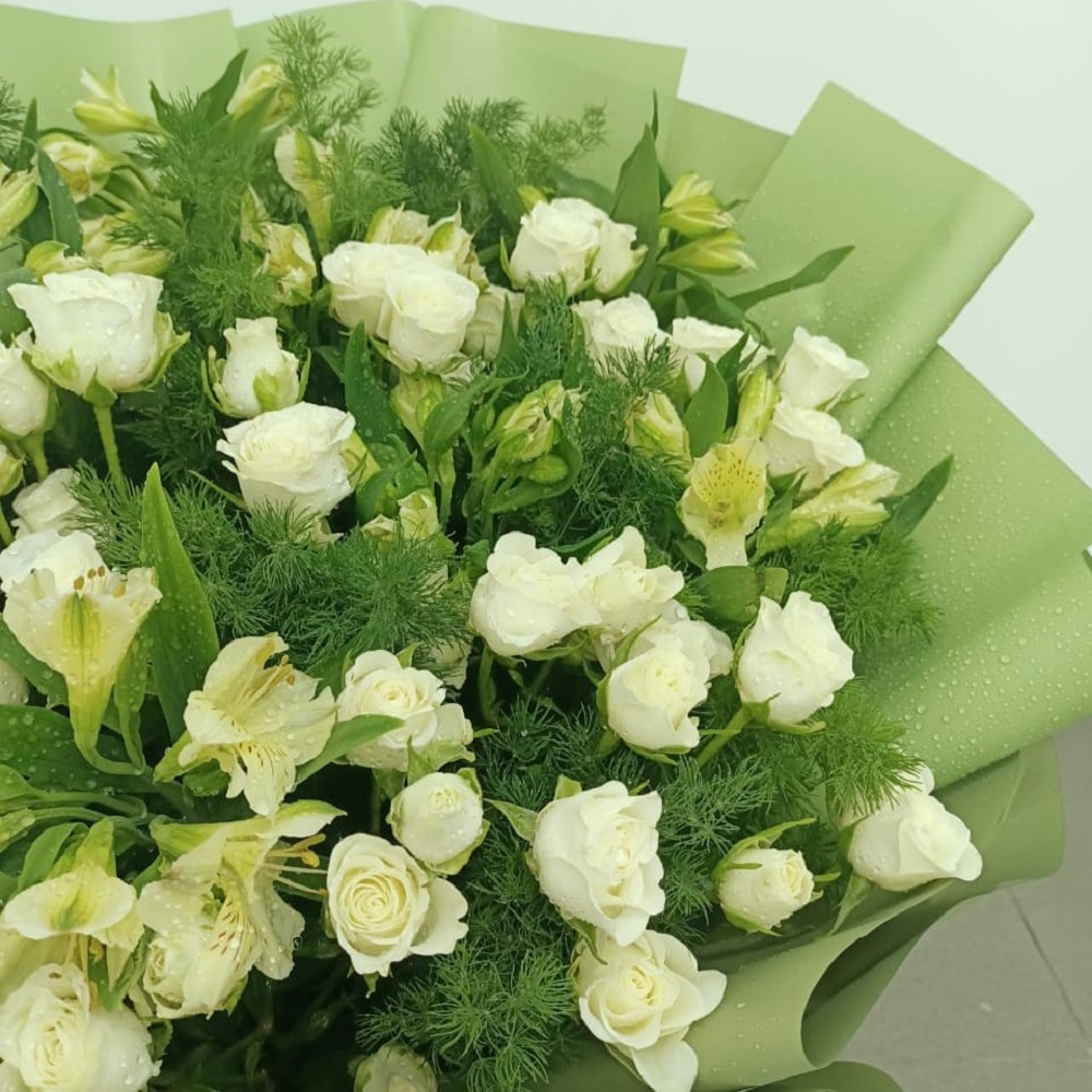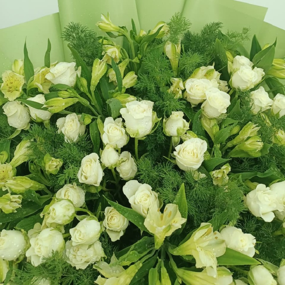 باقة أنيقة بأزهار الجوري باللون الأبيض وأزهار السترومريا باللون الأبيض مع أزهار بيضاء إضافية وأوراق خضراء غنية، مغلفة بورق أخضر فاتح ومربوطة بشريطة متناسقة، مناسبة للتعزية والتهنئة وإضفاء لمسة من الجمال النقي على أي مكان.
