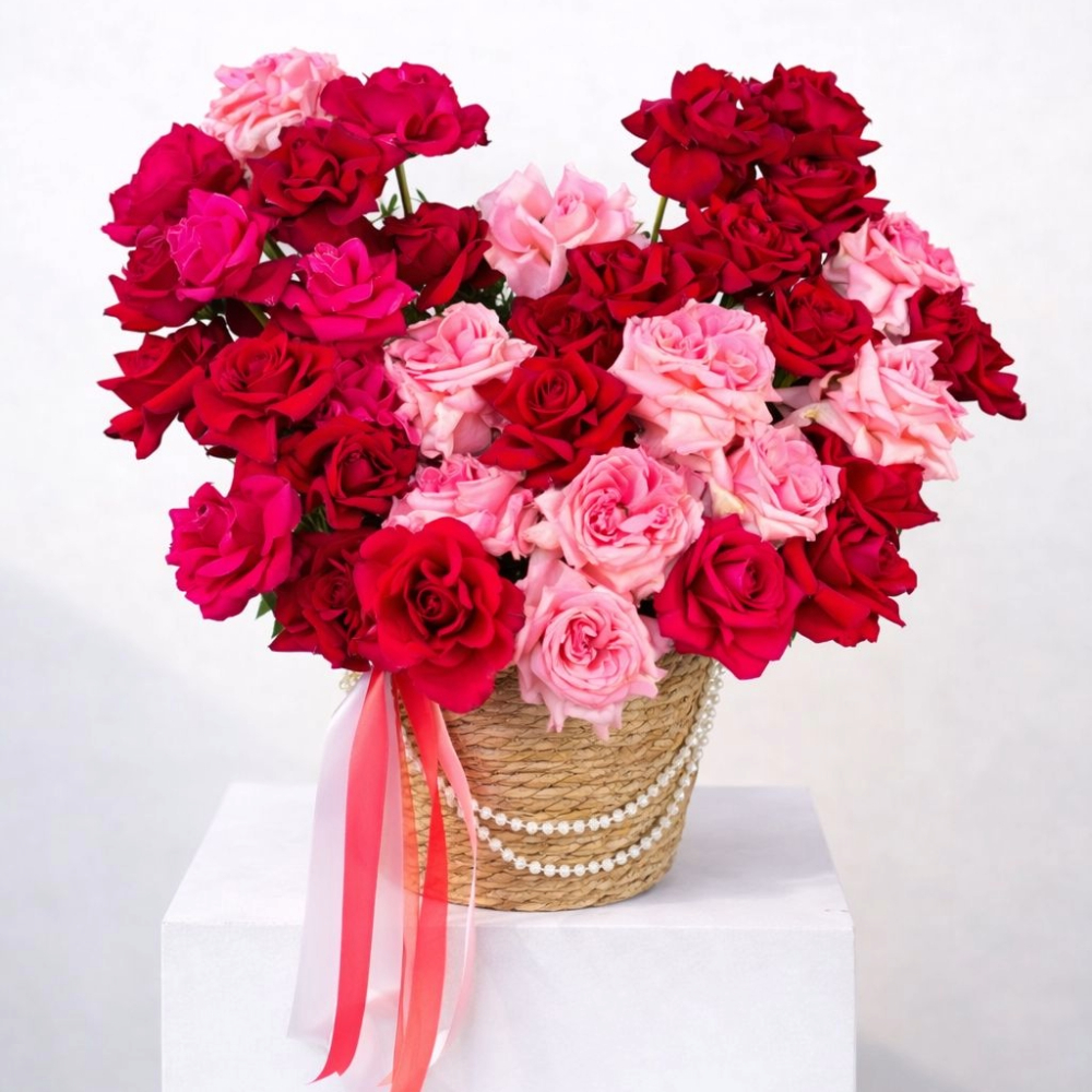 باقة زاهية تضم 15 زهرة جوري حمراء، 10 زهور جوري بلون الفوشيا، 10 زهور وردية من نوع أوهارا، و3 أوراق فستق، مرتبة بأناقة في سلة متوسطة ومزينة بسلاسل لؤلؤية وأشرطة حمراء ووردية وبيضاء.