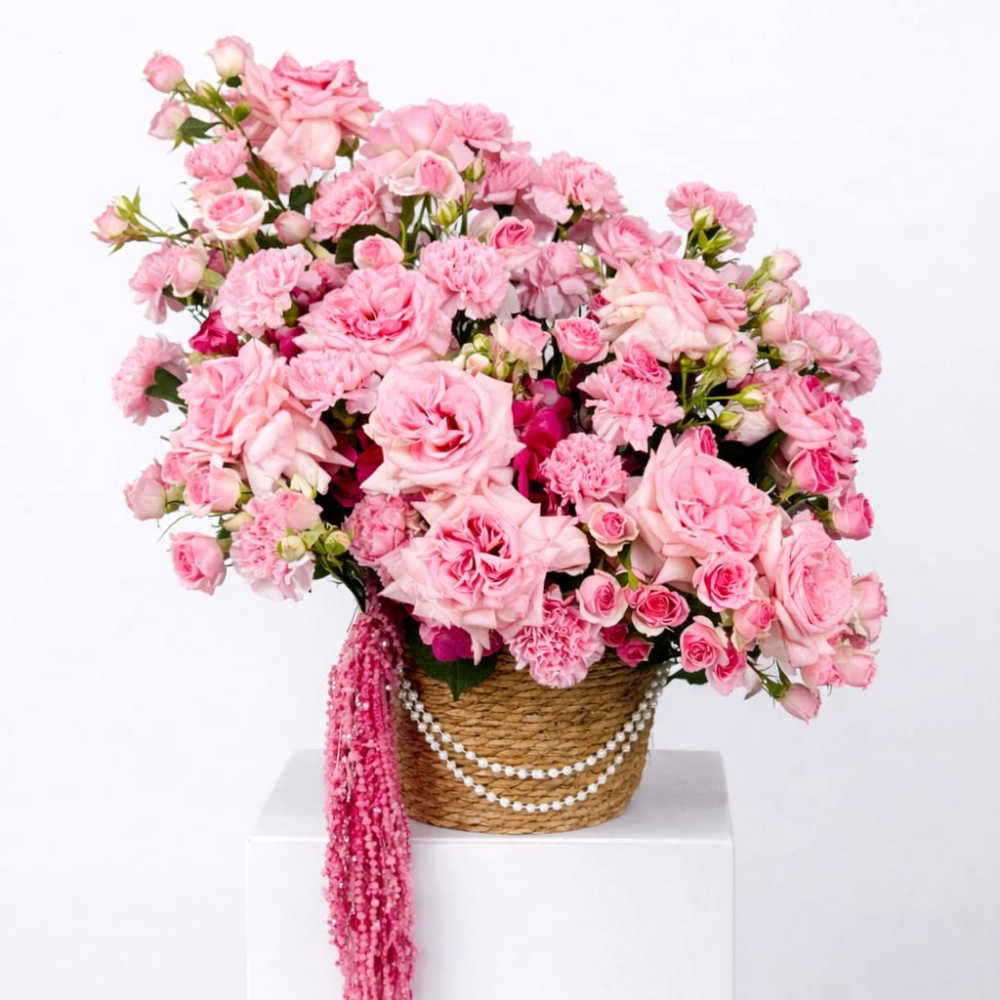 باقة مذهلة تضم 10 زهور جوري أوهارا وردية، 10 زهور بيبي جوري دينارا وردية ، 3 زهور هايدرينجا وردية، 20 زهرة كارنيشن وردية، و3 أوراق فستق، مرتبة بشكل جميل في سلة مع سلاسل لؤلؤية ولمسات من الأميرانثس الوردي المجفف.
