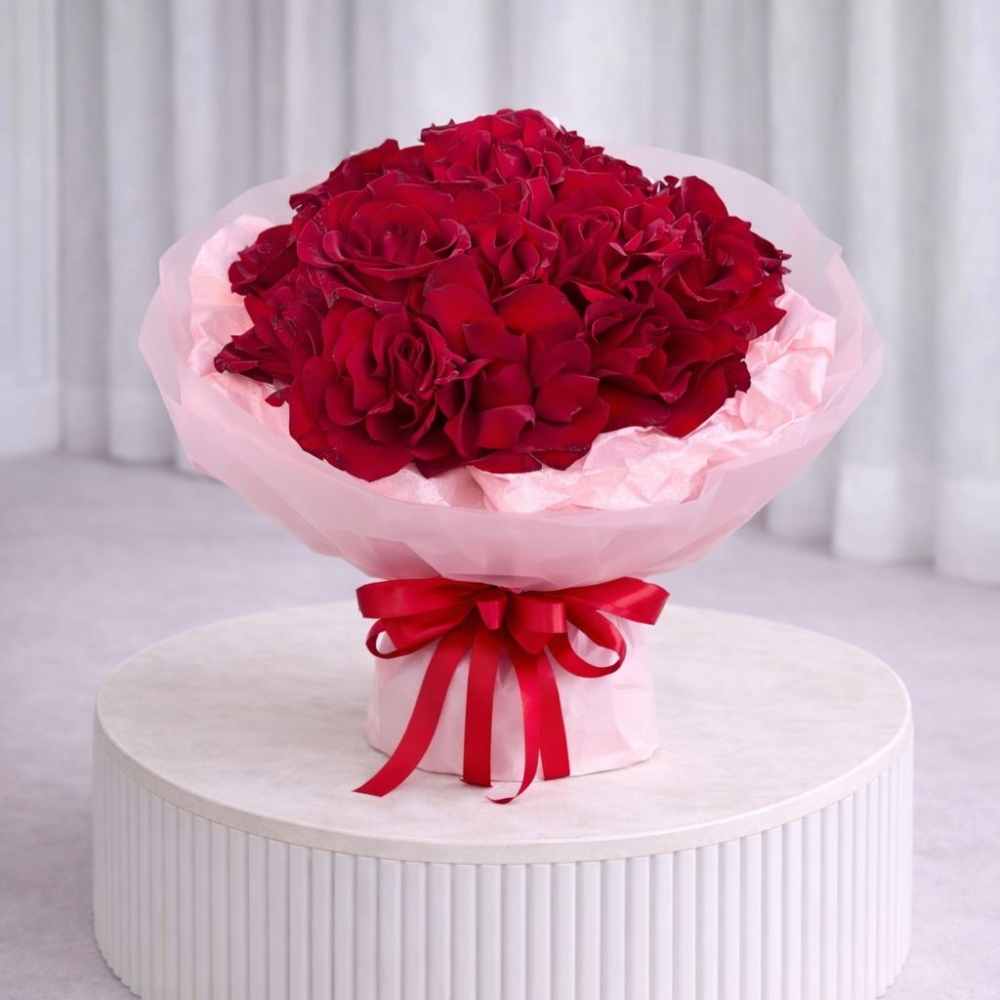 باقة رقيقة مكونة من 15 زهرة جوري حمراء فاخرة، ملفوفة بورق مناديل وردي وغطاء شفاف أبيض، ومزينة بشريط أحمر. تعبير رائع عن الحب بلمسة ناعمة وعصرية.