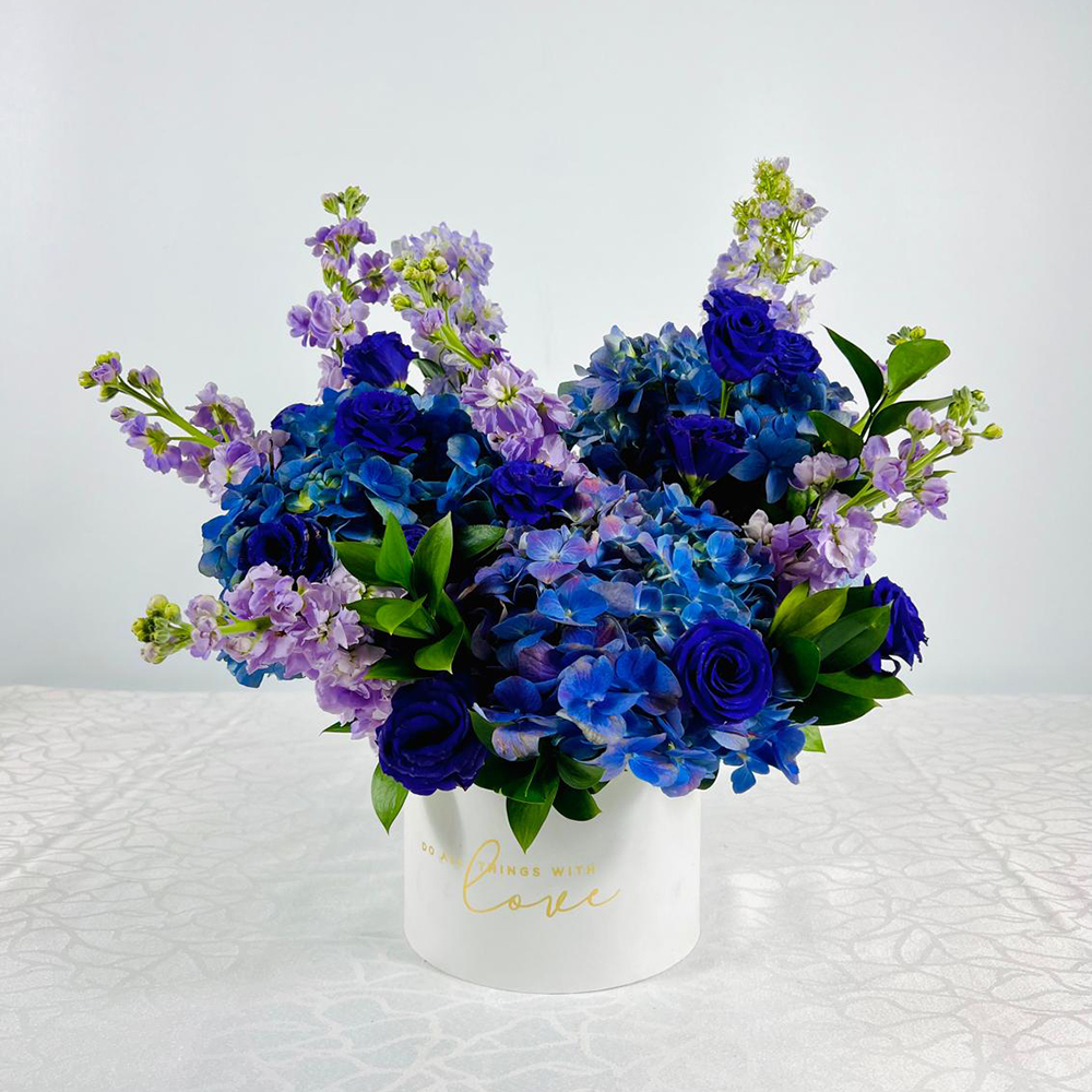 ترتيب صندوق دائري أبيض فاخر مملوء بمزيج ساحر من درجات اللون الأرجواني. تتميز هذه الباقة بـ 8 سيقان من الماثيولا، مما يخلق حضورًا جريئاًُ وآسراً. تضيف 7 سيقان من الليزيانثوس الأرجواني أناقة وعمقاً، بينما تجلب 3 أزهار هايدرينجا أرجوانية تبايناً ناعماً ولكنه نابض بالحياة. تكتمل التركيبة بالقوام الغني من الروسكوس (8 سيقان) والفستق (3 أغصان)، مما يعزز الجمالية العامة.