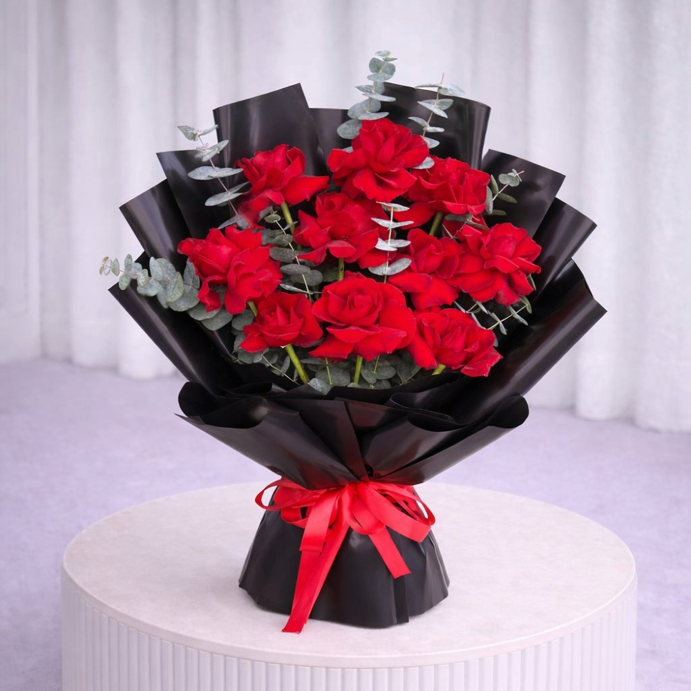 باقة مدهشة مكونة من 10 زهور جوري حمراء فاخرة مزينة بأوراق الأوكالبتوس الطازجة، ملفوفة بورق أنيق أسود ومزينة بشريط أحمر. تعبير قوي عن الشغف والرقي.
