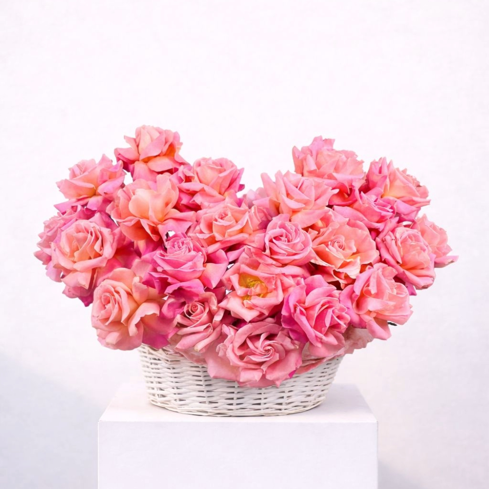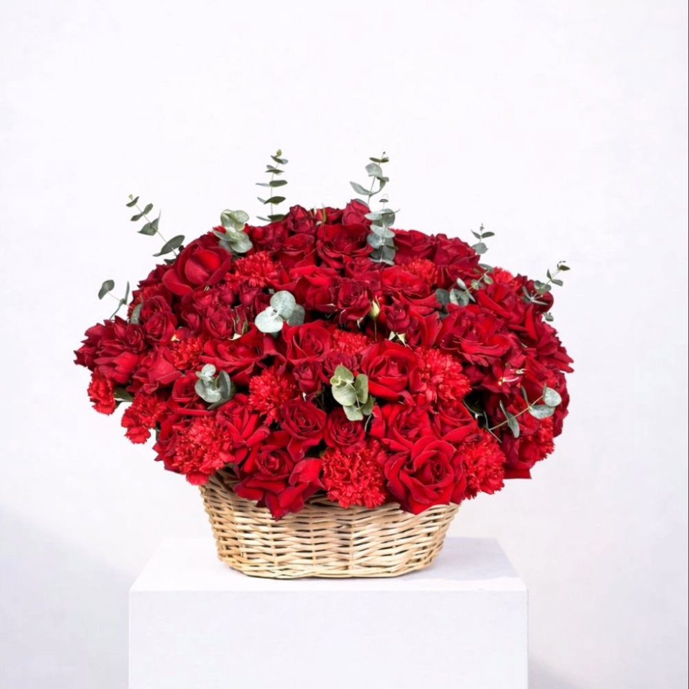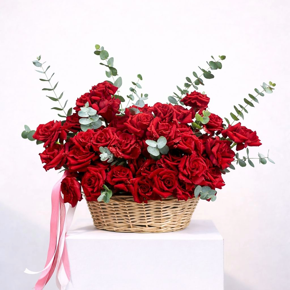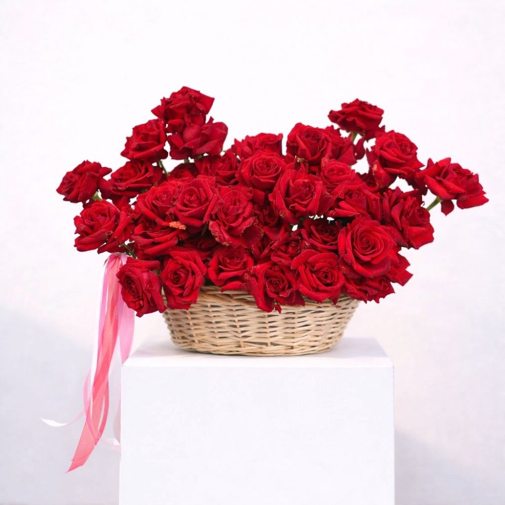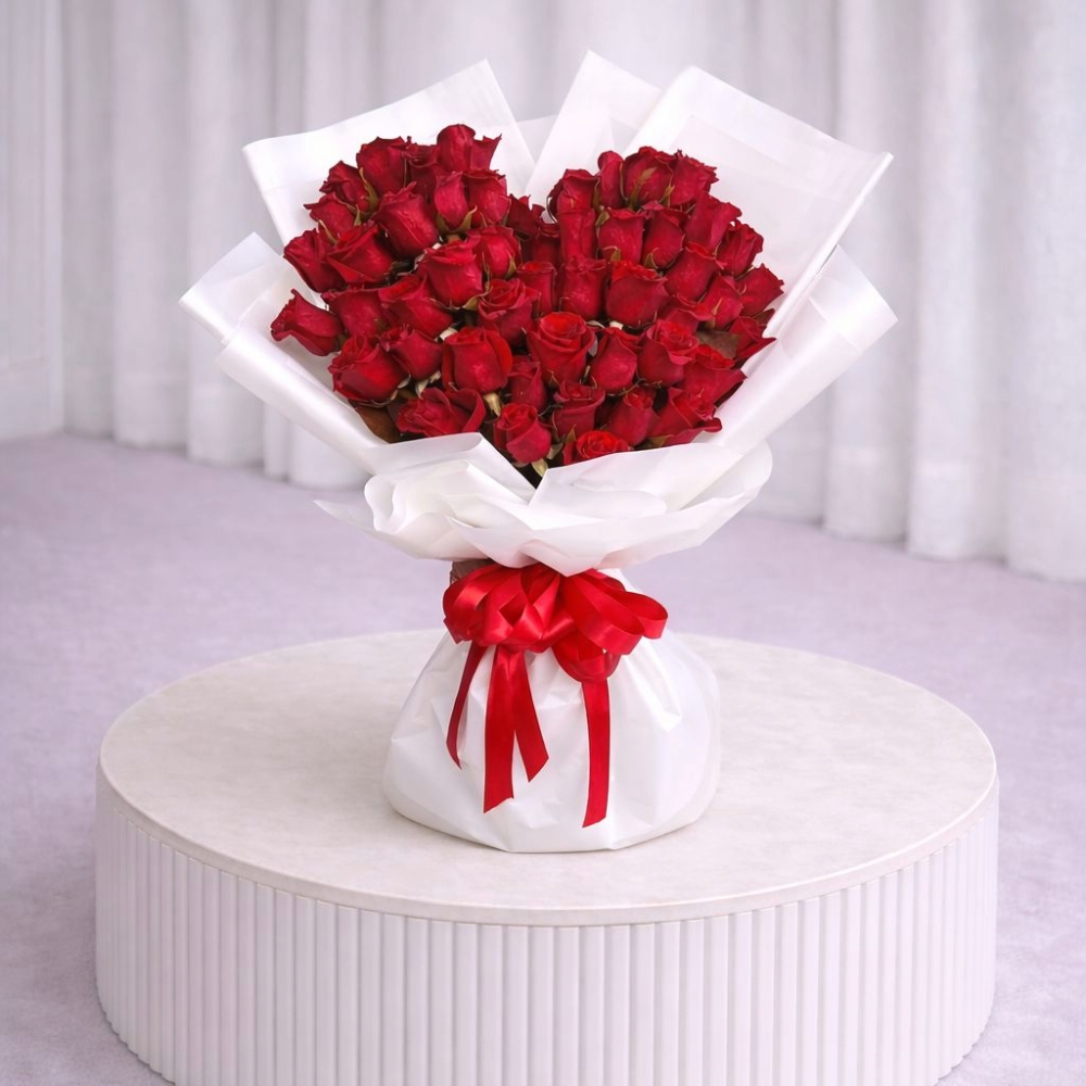 باقة رائعة من 50 زهرة جوري حمراء زاهية، ملفوفة بأناقة باللون الأبيض ومربوطة بشريط أحمر. مثالية للتعبير عن الحب العميق والمشاعر الصادقة.
