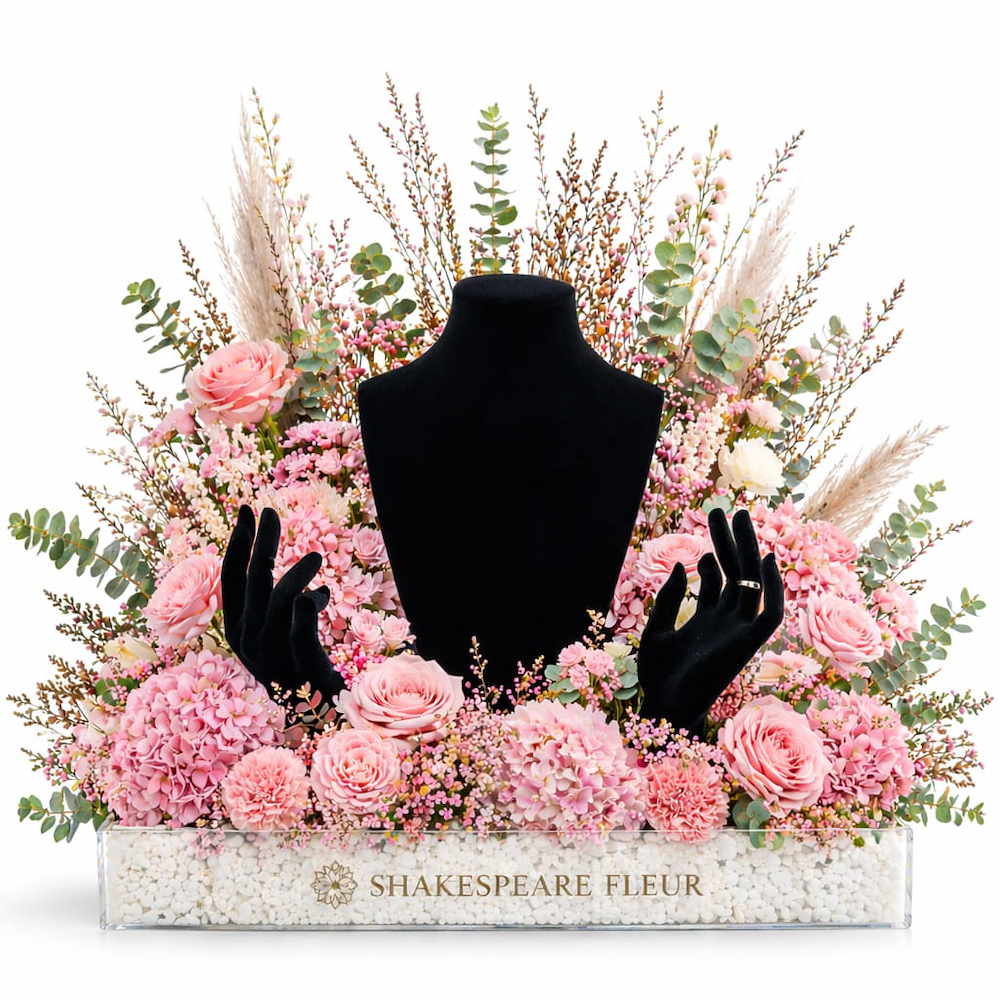 صينية أنيقة تتميز بالأزهار الصناعية مع ستاند المجوهرات الإحتفالي.
