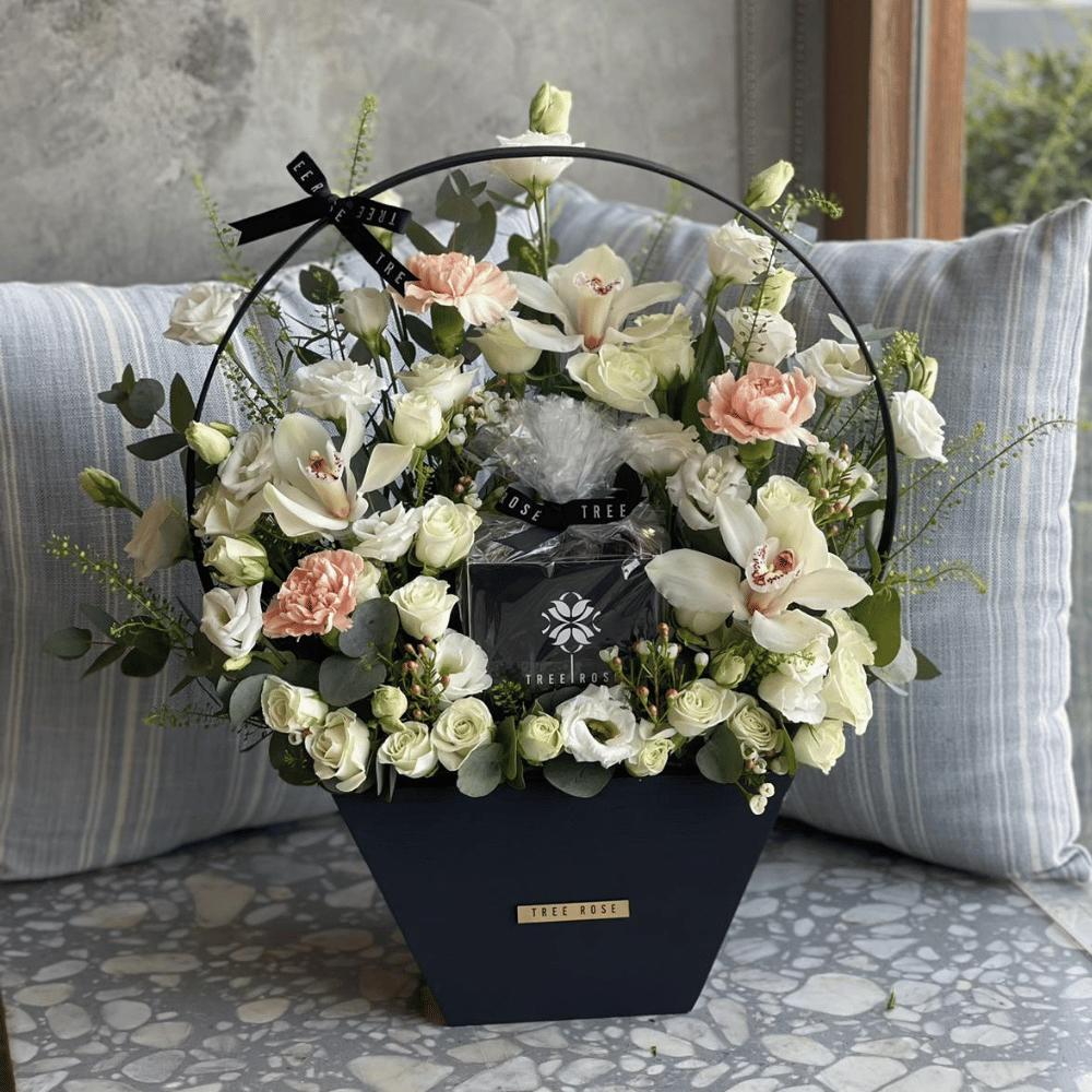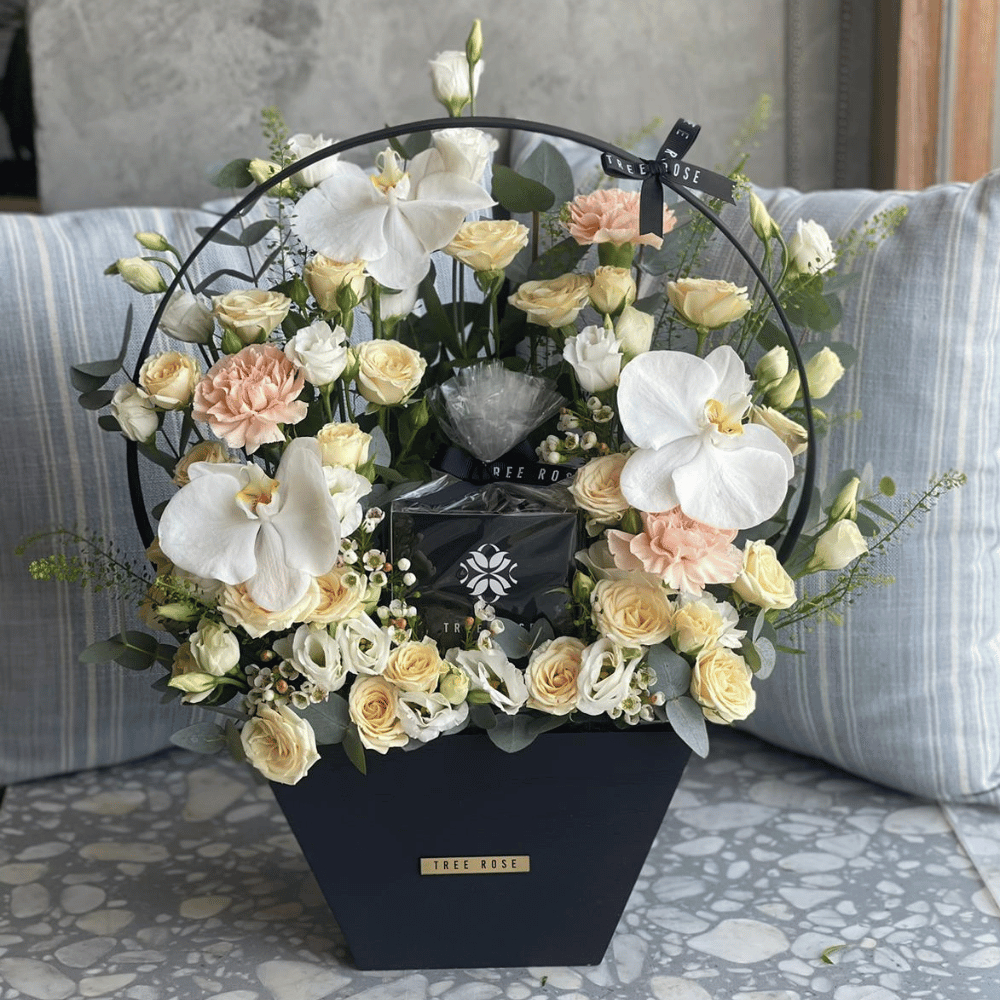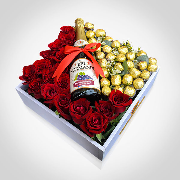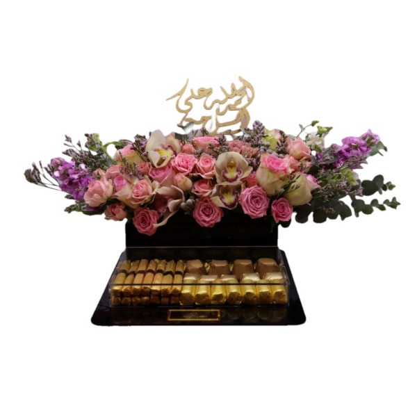هذا الصندوق من الأكريليك يحتوي على زهور الجوري مع 500 جرام من الشوكولاتة المختارة.