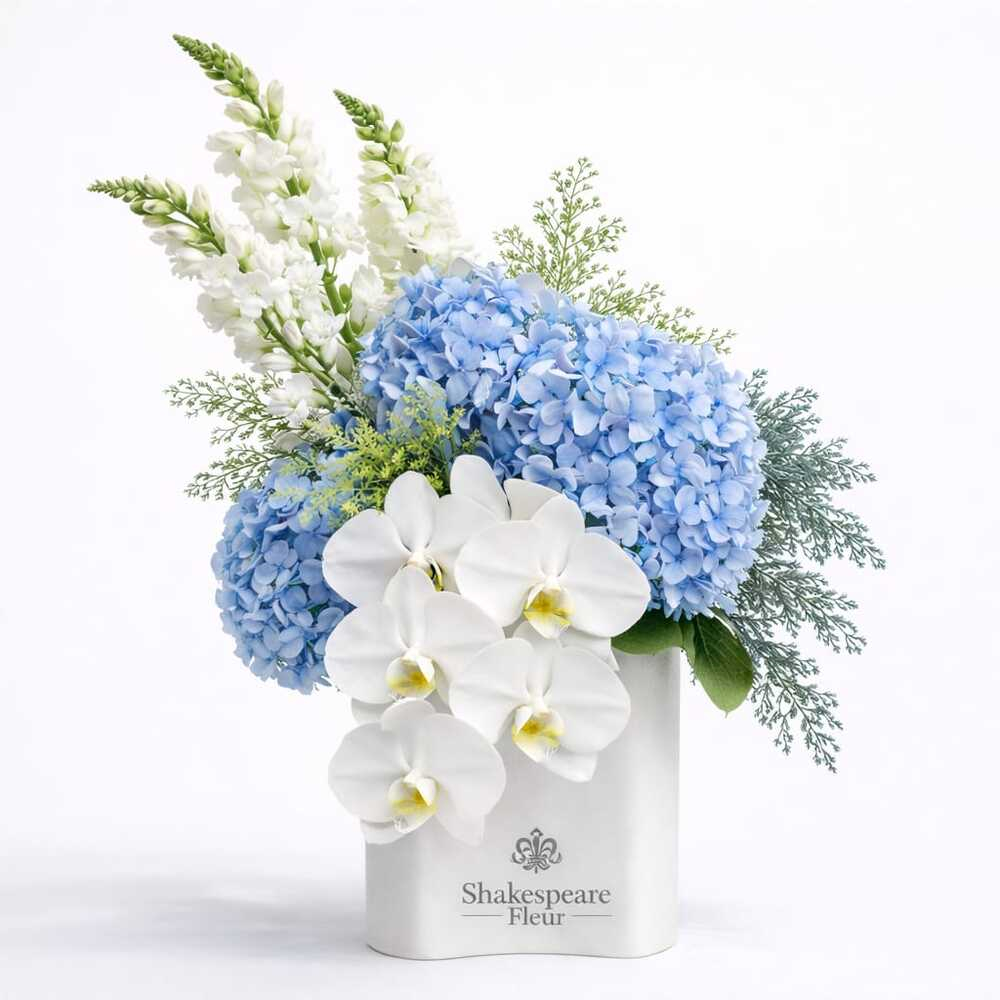 فازة خزفية أنيقة تتميز بأزهار الكوبية وأزهار الأوركيد.