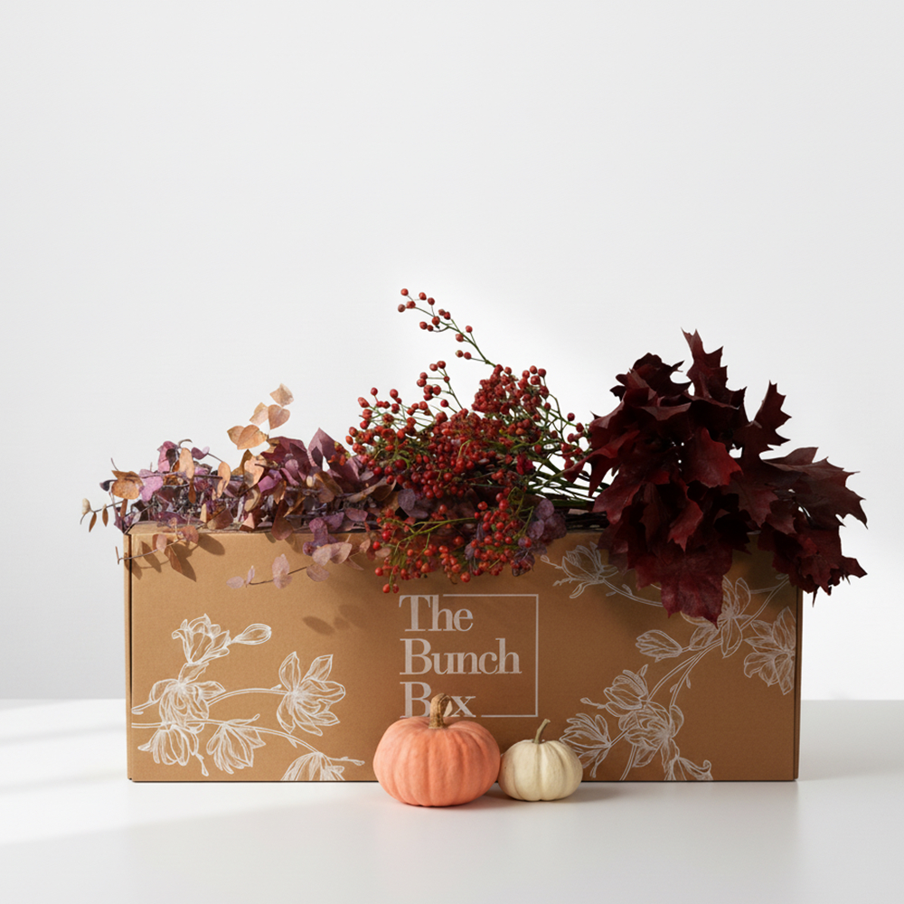 تنسيق خريفي دافئ يضم أوراق الأوكالبتوس، الجوري وأوراق البلوط، بالإضافة إلى قرعتين إحتفاليتين، إحداهما برتقالية والأخرى بيضاء. مثالي كقطعة مركزية، فهو يجسد جمال الخريف، ويتضمن زينة زهور تضفي على تنسيقك لمسةً من النضارة.
