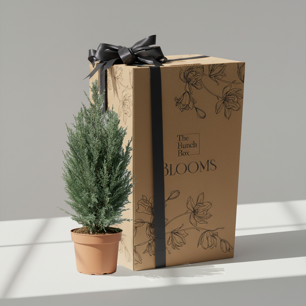 بلانتر انيق بتصميم مليئ بنبات دائم الخضرة بابر ناعمة باللون الاخضر المزرق, مناسب كنبات داخلي انيق على مدار العام.