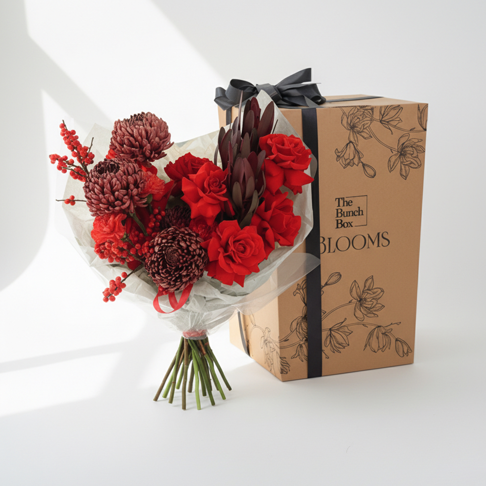 يجمع هذا التنسيق الفني بين زهور الجوري، الكريز وأوراق السفاري سن سيت، مع توت أحمر نابض بالحياة. مكتملة بثلاث طبقات من التغليف المصمم وعلبة هدايا مميزة تحمل علامتنا التجارية، لتكون تحية جريئة وراقية لرابطك الأبدي.