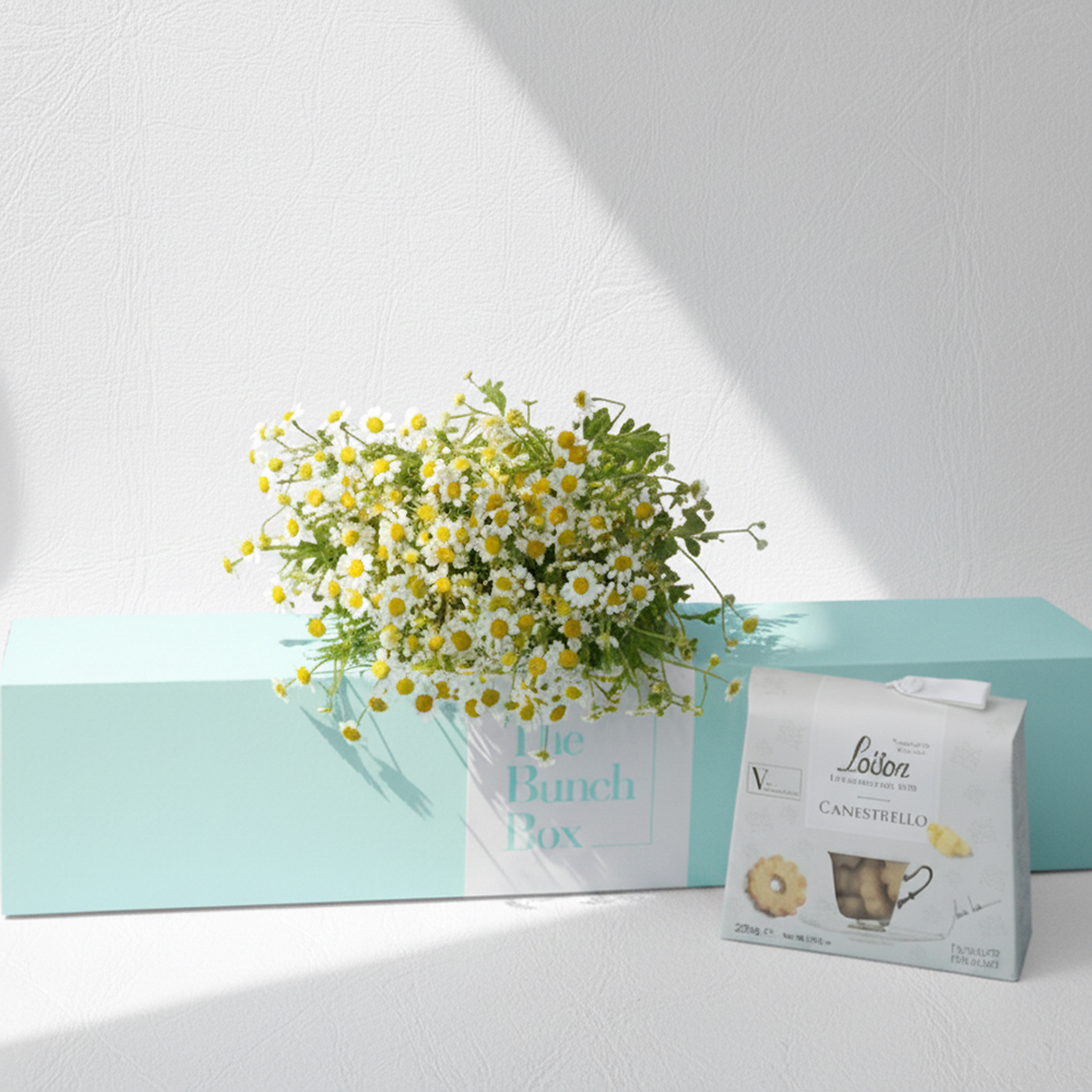 بوكس يحتوي على 10 جذوع من أزهار التاناسيتوم ديزي مع 200غ بسكويت لويسون كانيستريلو.