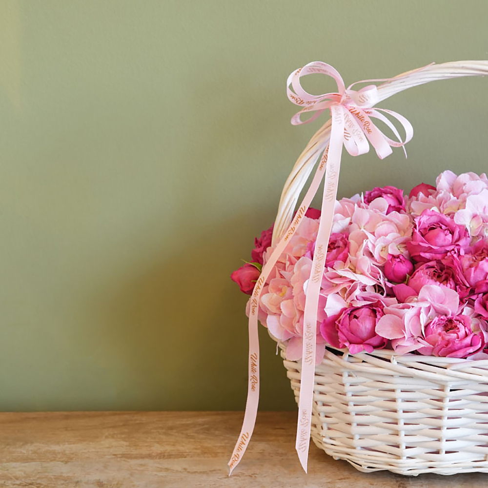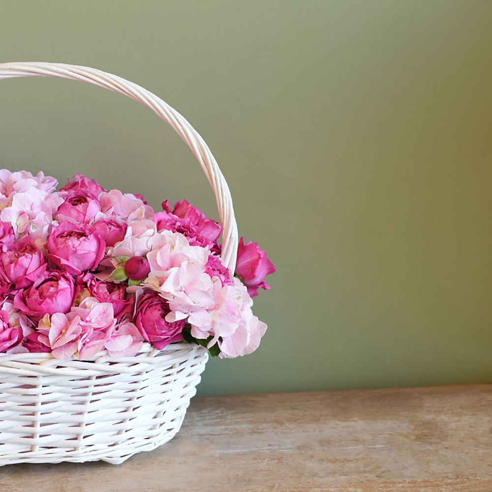 باقة تحتوي على زهور الجولييتا والهايدرينجا الوردية، مرتبة بشكل جميل في سلة.