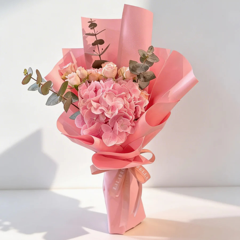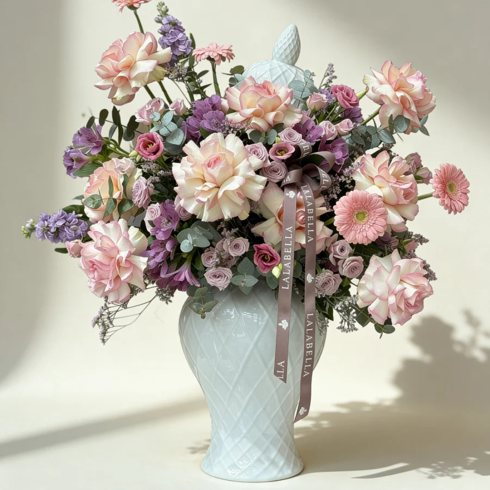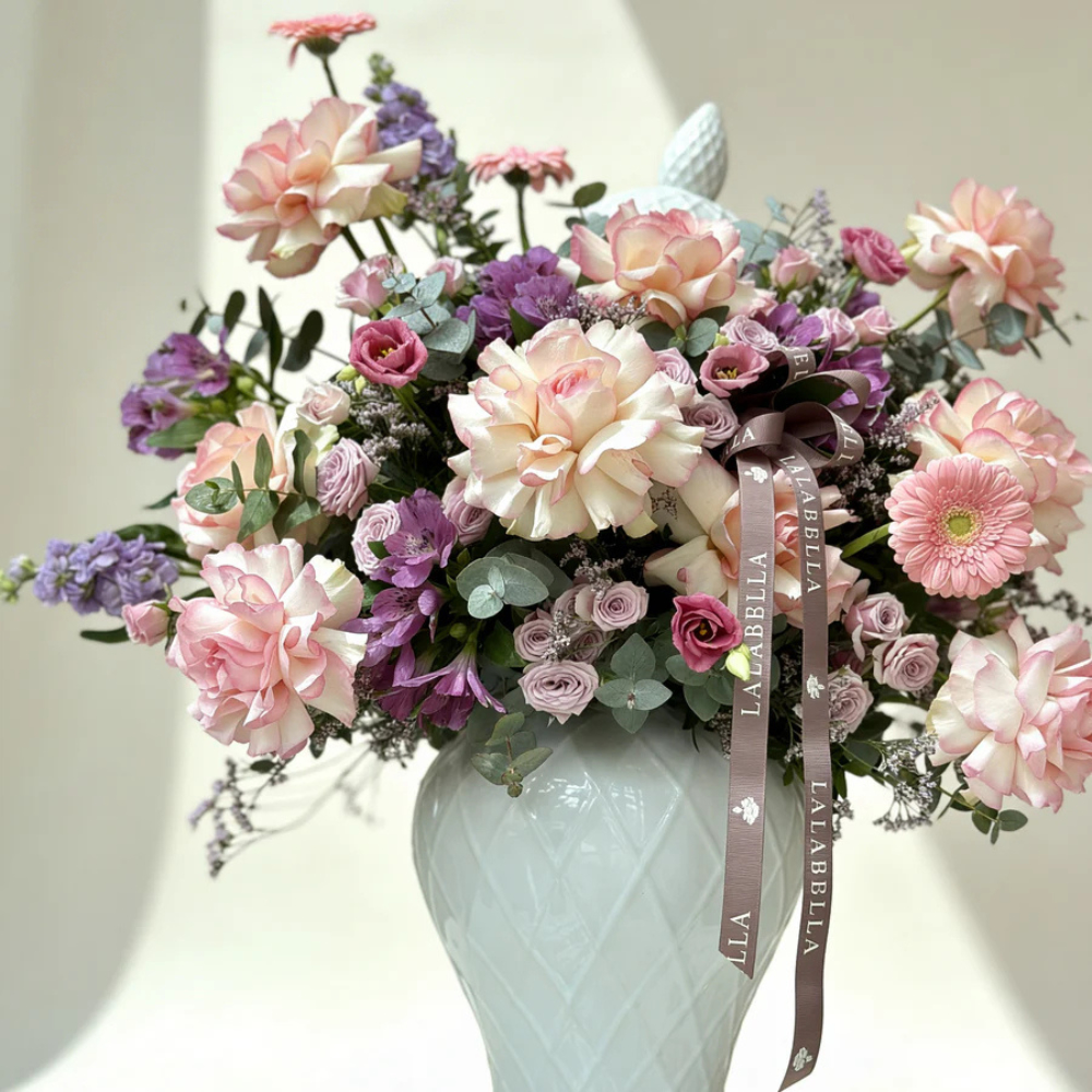 فازة تحتوي على الجوري، البيبي جوري، الجيربيرا، الالستروميريا، الماثيولا واوراق اليوكالبتوس.