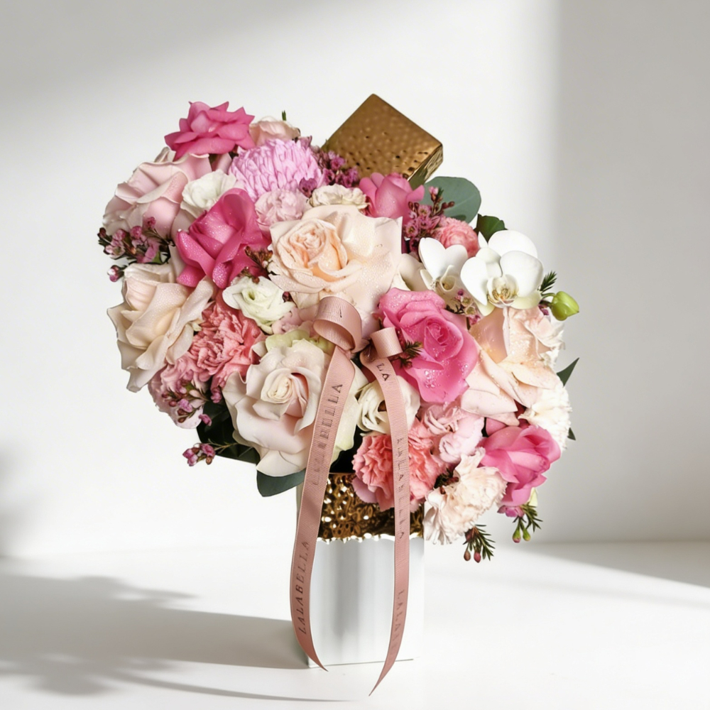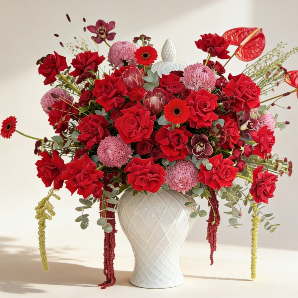 ترتيب مزهرية مذهل يضم أزهارًا كثيفة بألوان غنية من الأحمر مع لمسات دقيقة من الوردي، مصممة بشكل جميل لخلق تأثير جريء وأنيق في الوقت نفسه.