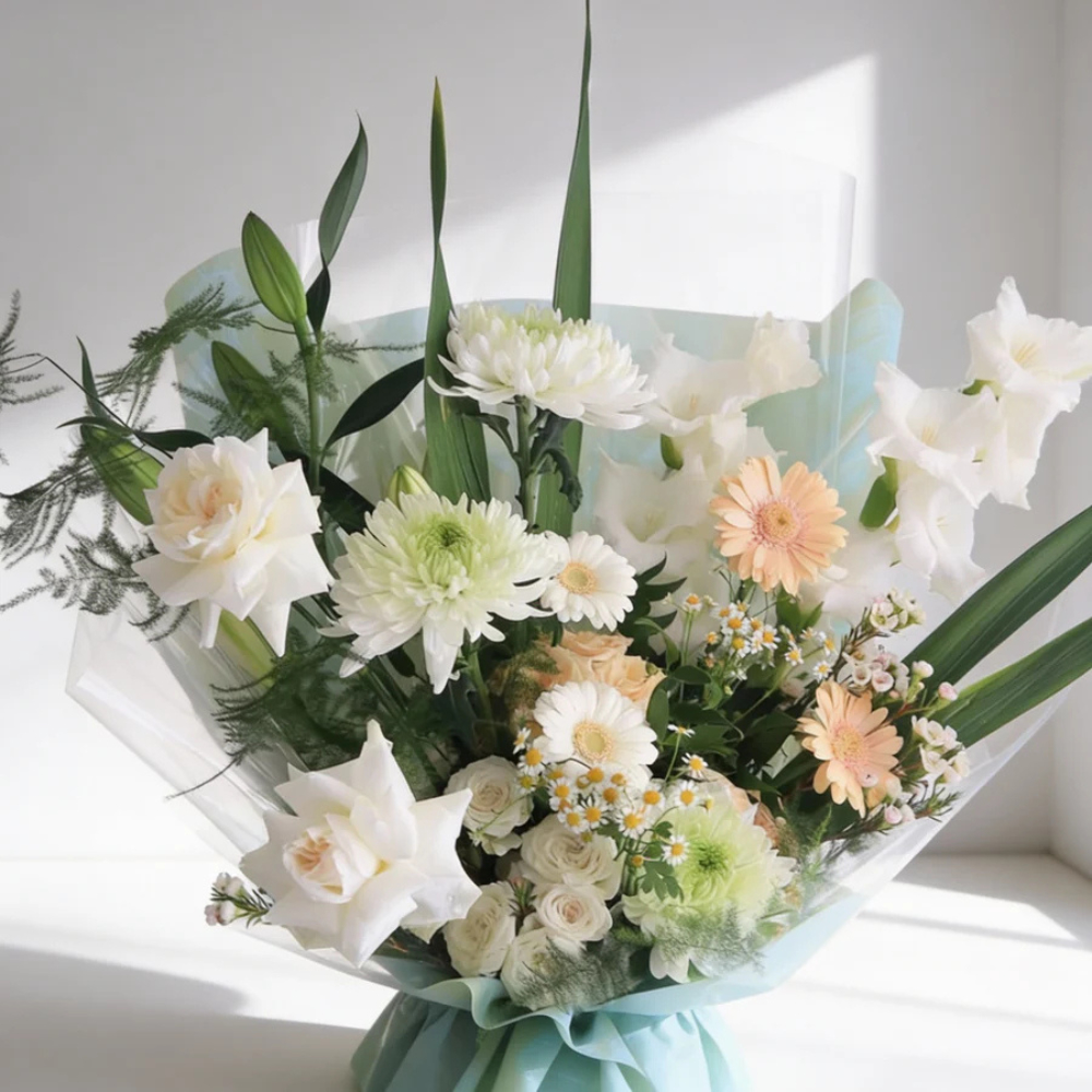 باقة زهور ناعمة ورقيقة بألوان الباستيل المنعشة، تضم مزيجاً من الزهور البيضاء والكريمية والخوخية، الجوري، البيبي جوري والكريز، مع لمسة من الخضرة النضرة. ملفوفة بورق زهور أخضر فاتح ومزينة بشريط كريمي.