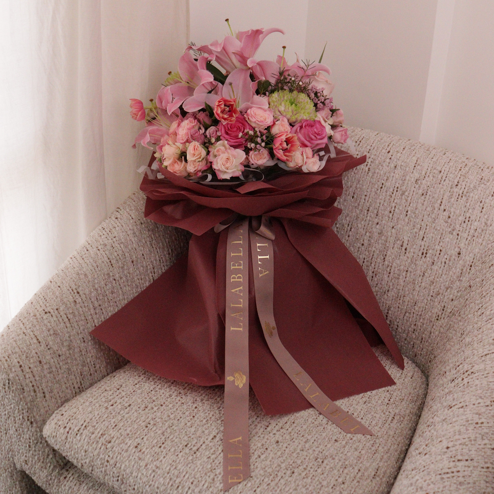 باقة يد جميل من زهور التوليب، الجوري والليلي. ترتيب بسيط وأنيق لأي مناسبة.