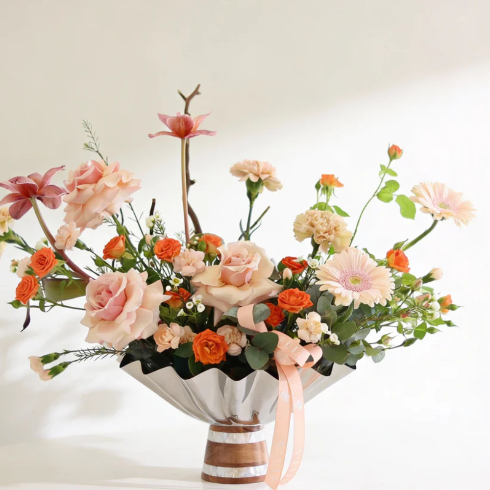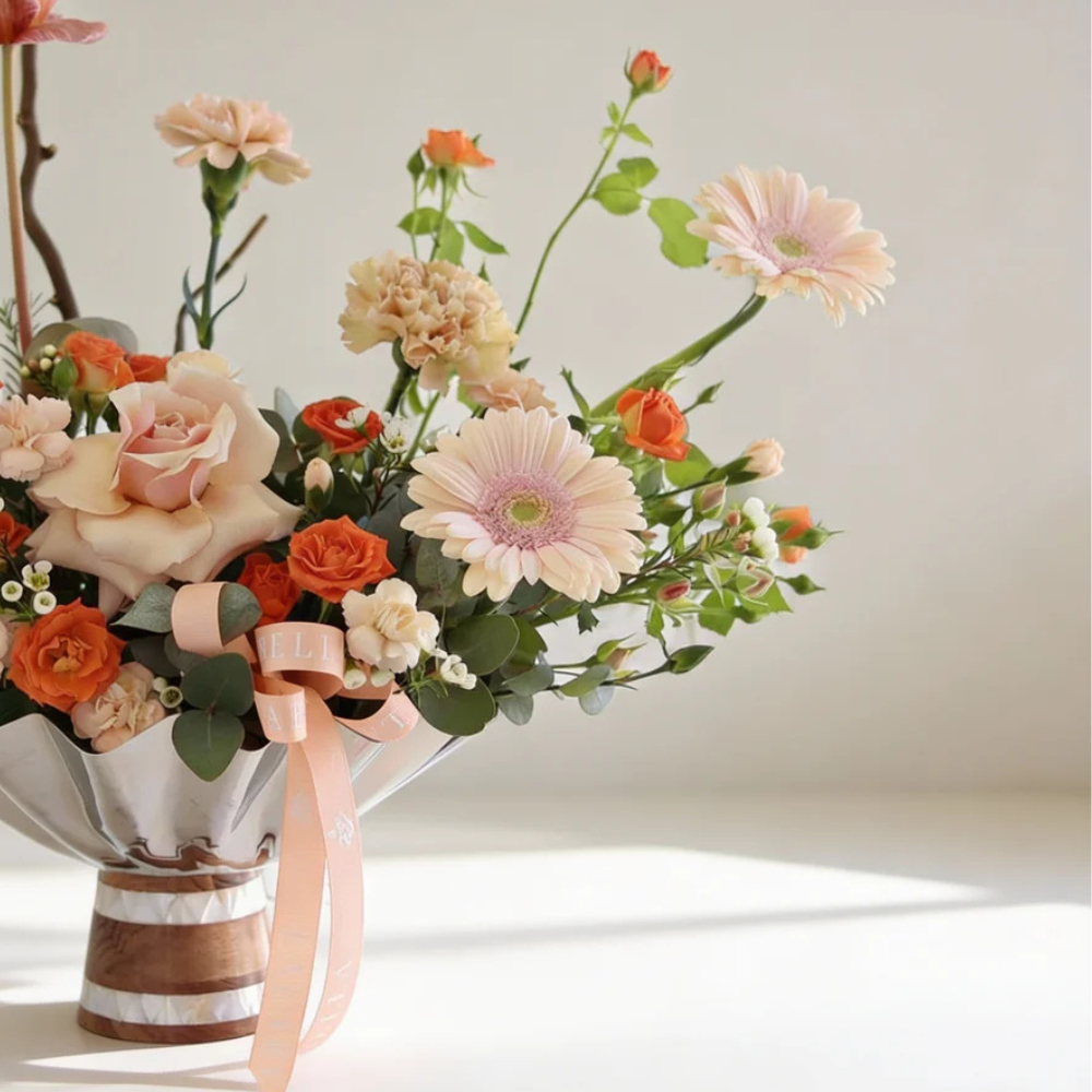 باقة نابضة بالحياة من زهور التوليب، الجيربيرا والجوري الموسمية بألوان دافئة، معروضة بشكل جميل في وعاء فولاذي بمقبض خشبي.