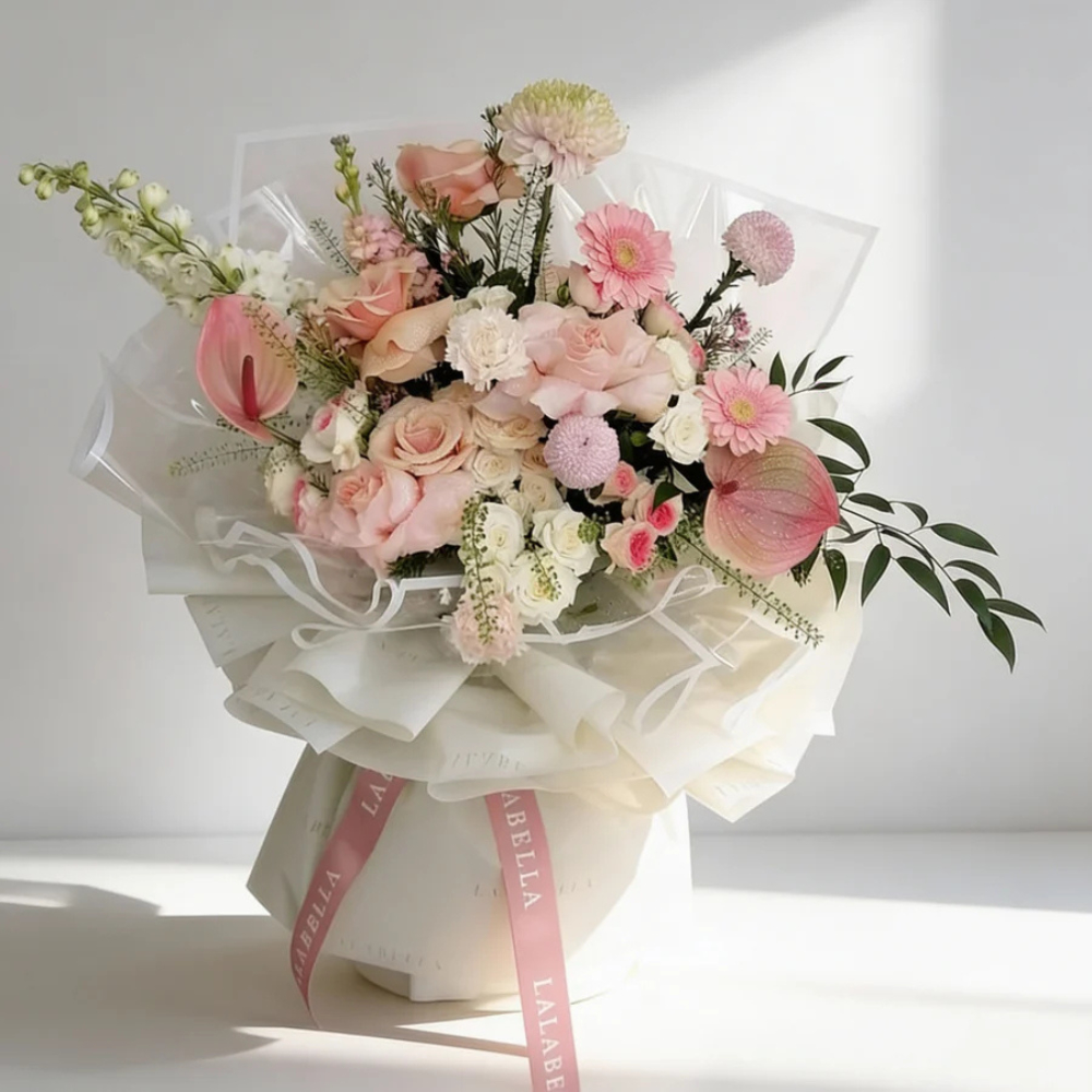 باقة زهور فاخرة من أزهار الباستيل الناعمة، تضم زهور الجوري، البيبي جور، الكارنيشن، الكريز والأنثوريوم، مرتبة بشكل جميل لتكوين تركيبة متوازنة وأنيقة تماماً.