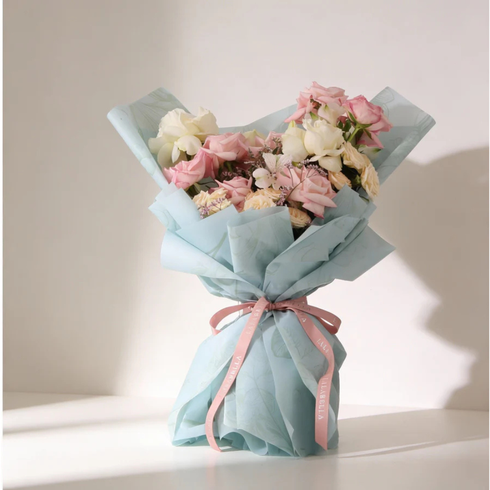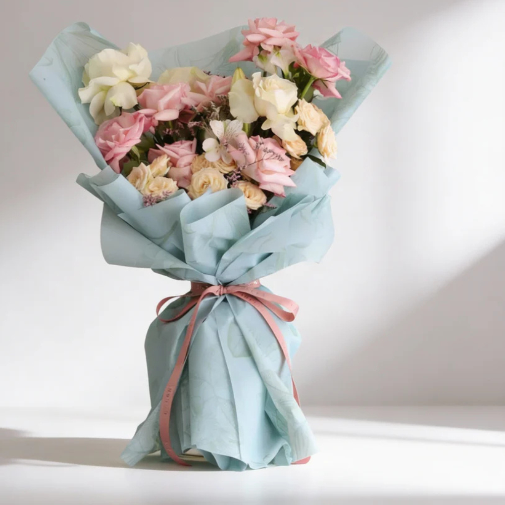 باقة يد بألوان الباستيل بالوردي الفاتح والعاجي، ملفوفة في لفافة زرقاء فاتحة، مزيج خفيف ومعبر من زهور الجوري والألستروميريا.