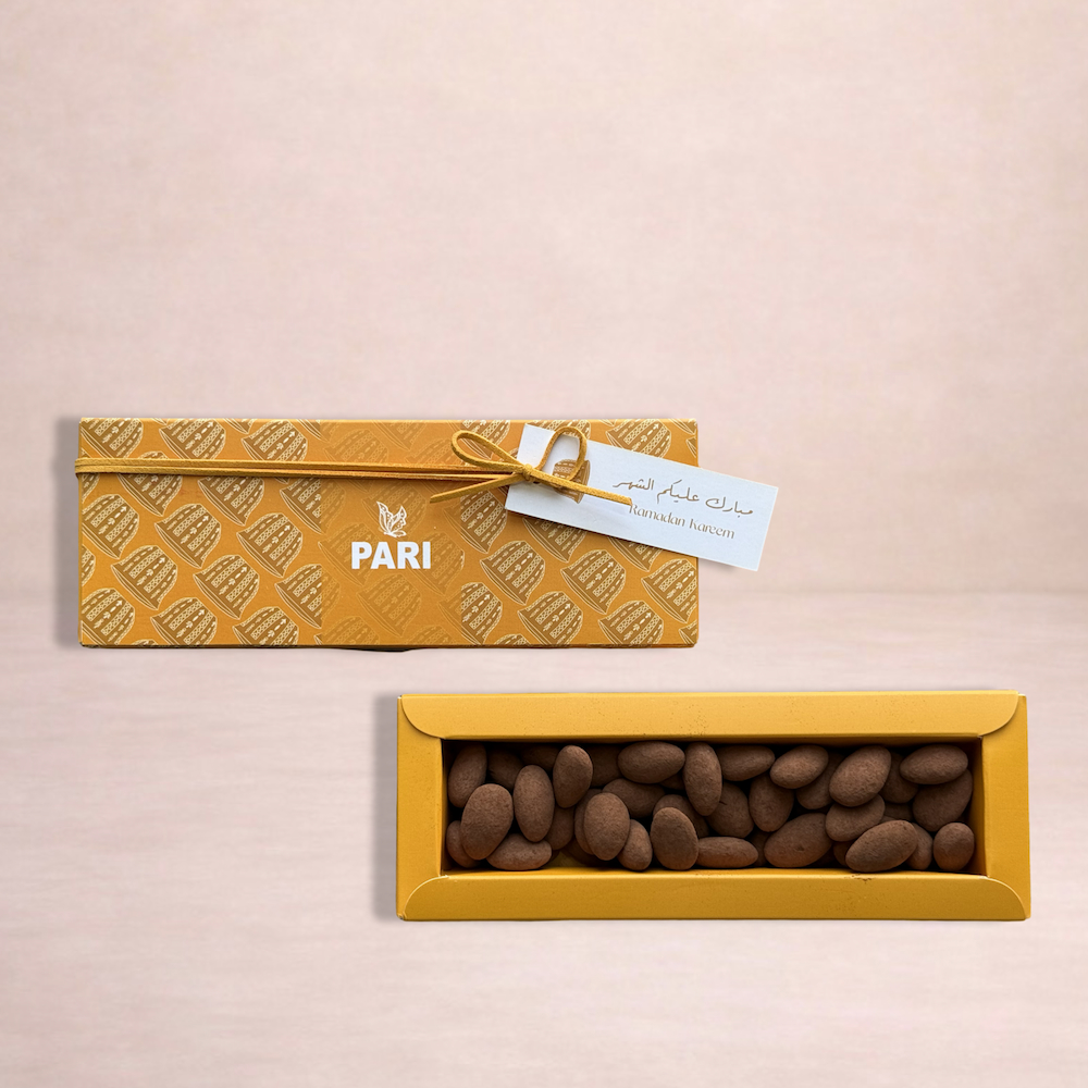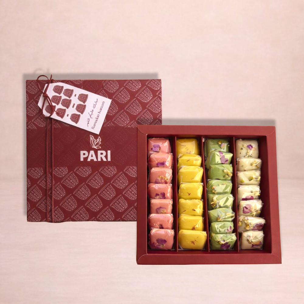 4 مرطبانات شوكولاتة، لوز مرشوش بالشوكولاتة، شوكولاتة بالفستق، شوكولاتة بالبندق، وشوكولاتة بالجوز. علبة صغيرة: مليئة باللوز المرشوش بالكاكاو. مقاس العلبة: 21.5 سم × 8 سم. علبة متوسطة: مليئة بشوكولاتة الفستق، شوكولاتة الورد، الشوكولاتة البيضاء، شوكولاتة الزعفران، وشوكولاتة السمسم. مقاس العلبة: 22 سم × 22 سم. علبة كبيرة: تحتوي على 30 قطعة من التمر الفاخر المحشو باللوز والمغطى بالشوكولاتة أو المكسرات. مقاس العلبة: 30.5 سم × 30.5 سم. جميع المنتجات منسقة بشكل جميل مع باقة زهور الجوري والكريز الطازجة في سلة هدايا. مقاس السلة: 42 سم × 36 سم.