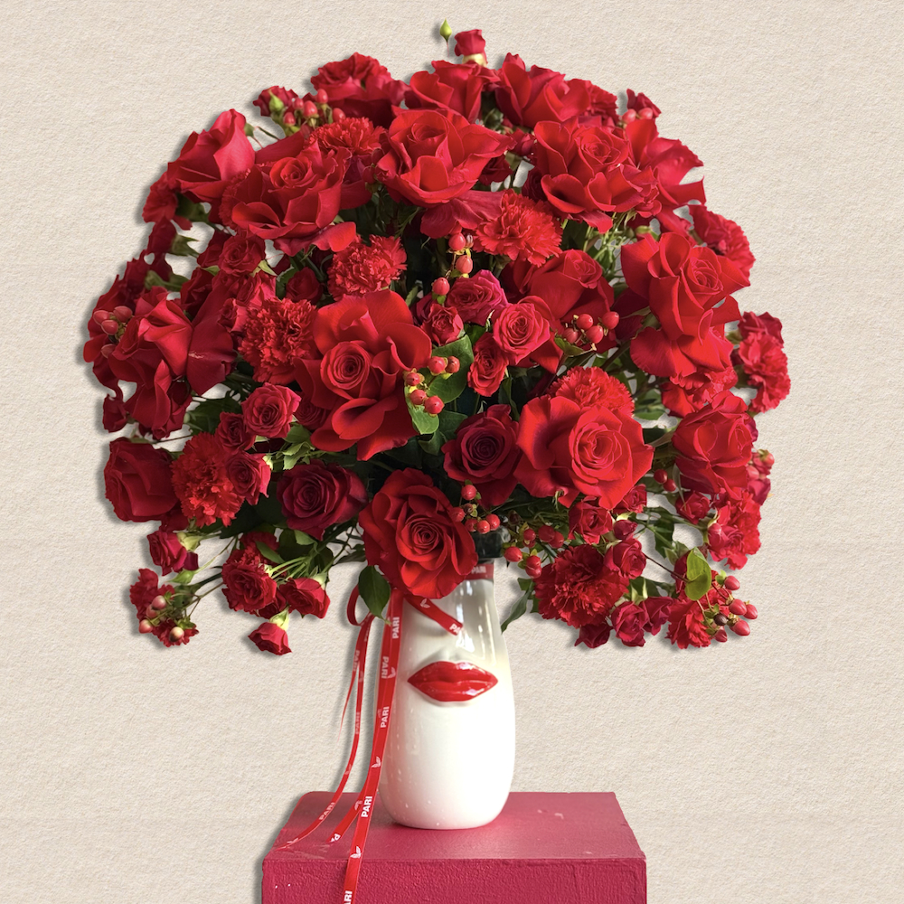 100 قطعة من كيت كات بحشوة الشوكولاتة مرتبة على صينية أكريليك مع ورد صناعي.