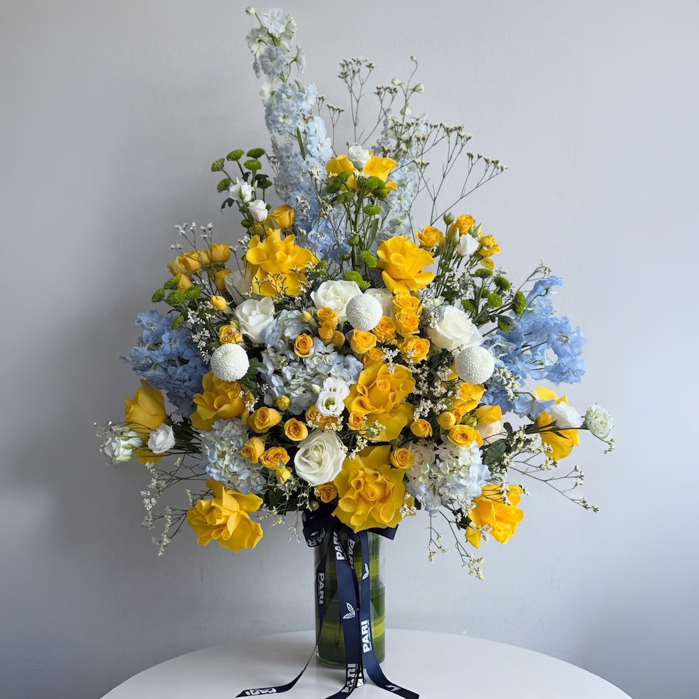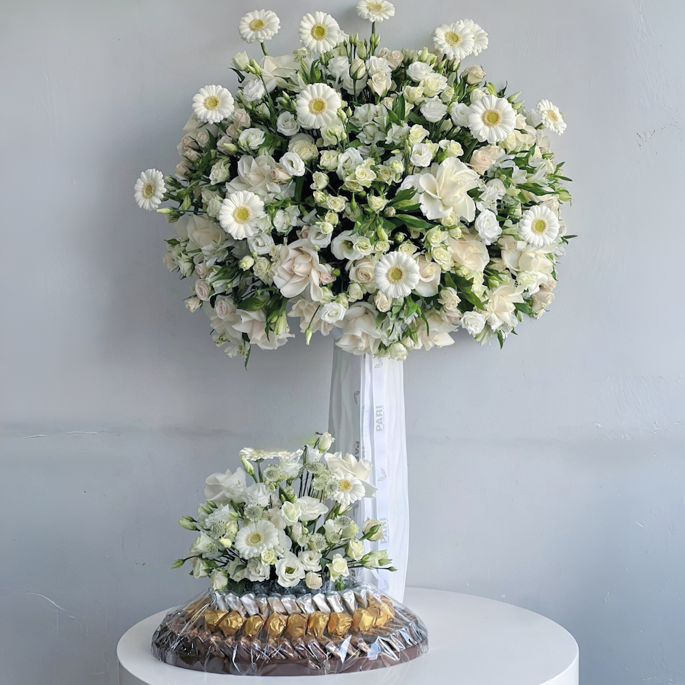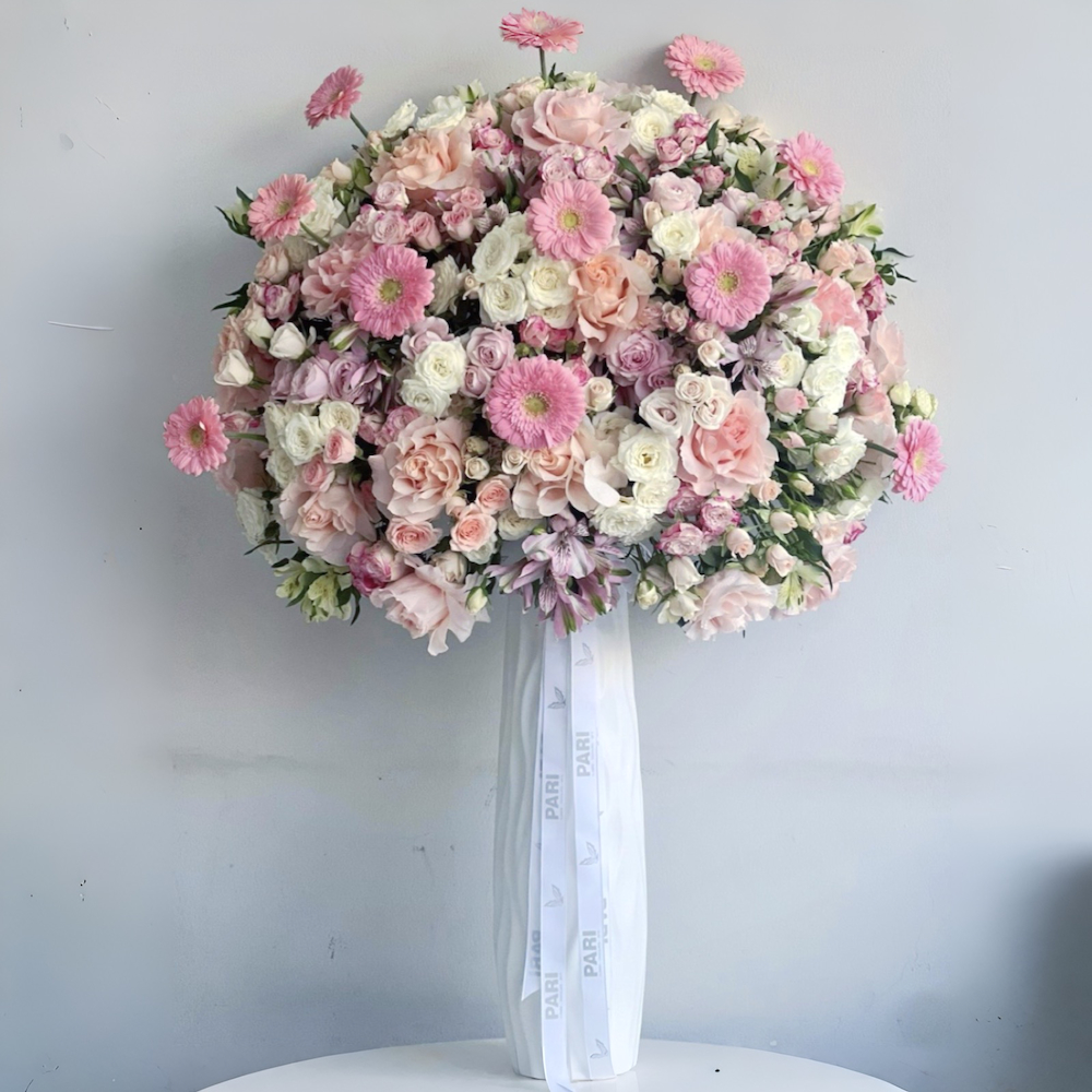 باقة زهور طازجة تتكون من الورود، والورود الصغيرة، والأستروميليا، والجربيرا في مزهرية بلاستيكية بيضاء مخططة.