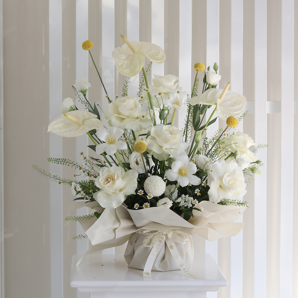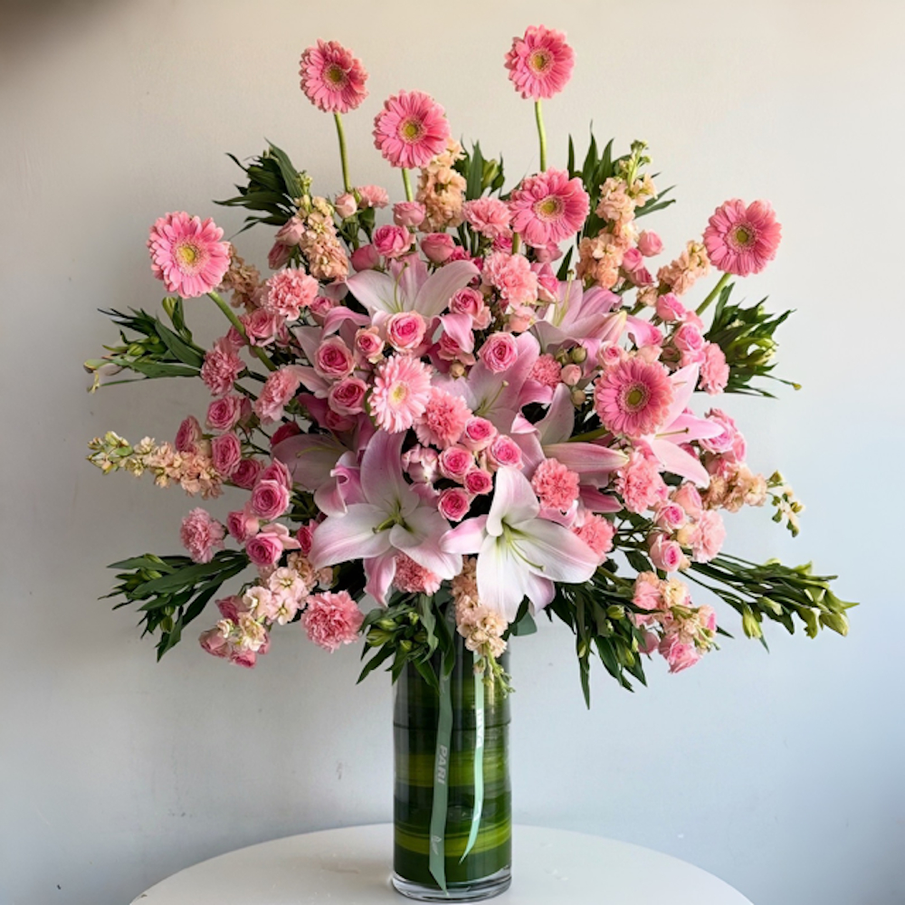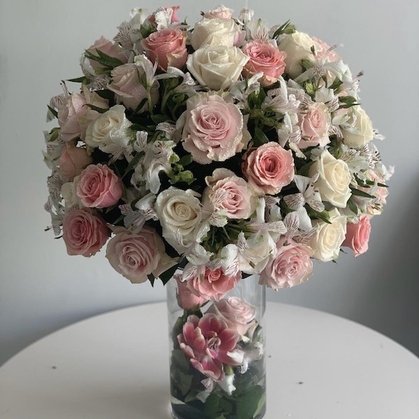 فازة زجاجية تحتوي على الجوري، الألستروميريا والدلفينيوم.