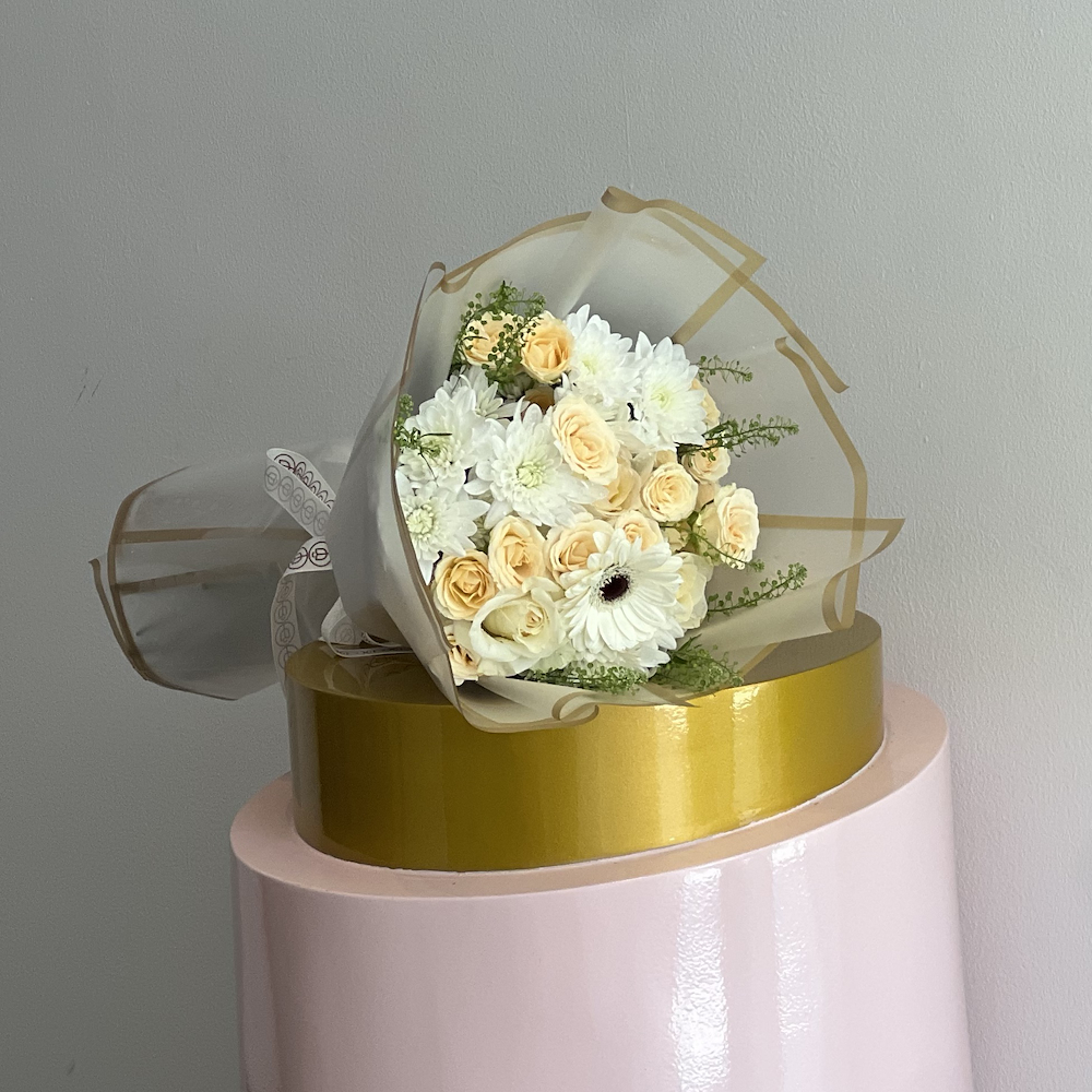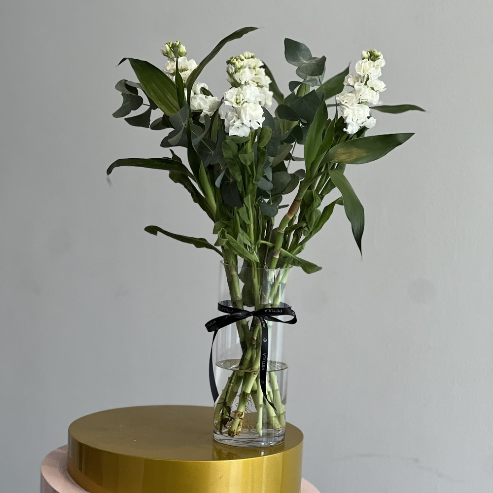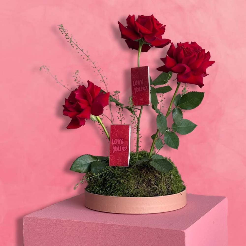 صينية تحتوي على أزهار الجوري، السترومريا، الجربيرا والأوكالبتوس مع الشوكولاتة.