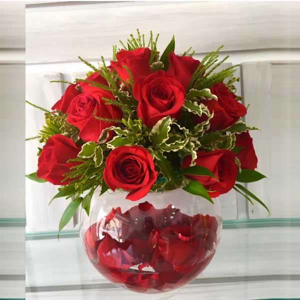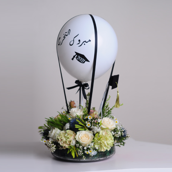 هذه الفازة من زهور الجوري مع بالون تهنئة التخرج ويمكنكم تخصيص الكتابة.