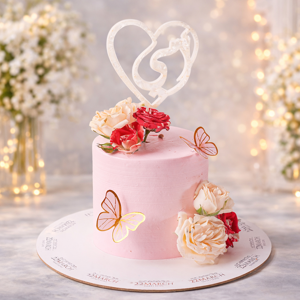 كيكة ناعمة بحجم 5 إنش باللون الوردي، بتصميم ناعم وخطوط أفقية خفيفة حول الجوانب. مزينة بأزهار حمراء وبيج موضوعة في الأعلى وعلى جانب الكيكة. تتزين الجوانب بفراشات تضيف لمسة أنيقة. وفي الأعلى تغريسة بتصميم قلب تحمل كلمة ماما بالعربي.