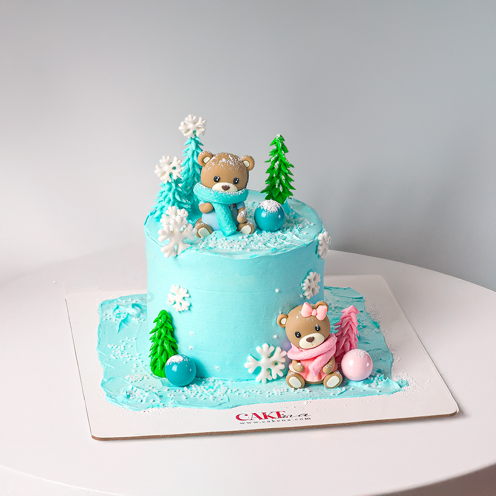 كيكة لطيفة بحجم 6 انش تكفي 8 الى 10 اشخاص بتصميم شتوي جذاب باللون الازرق الجليدي مزينة بمجسمات دب صغيرة واشجار ثلج وكرات لامعة وزينة رقاقات الثلج المجسمات غير صالحة للاكل ويمكن ازالتها قبل التقديم وتعد مثالية لاعياد ميلاد الاطفال واحتفالات الشتاء مع توفر نكهات مختلفة عند الطلب.