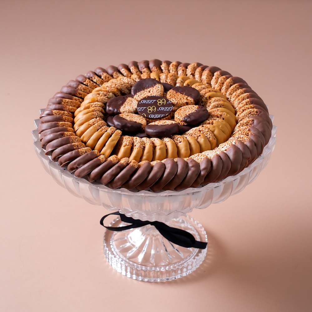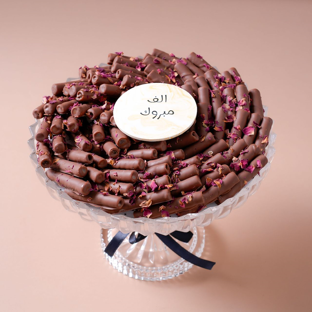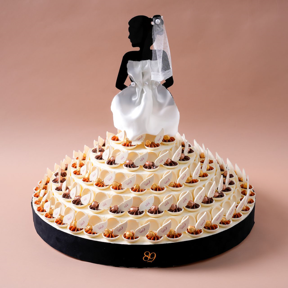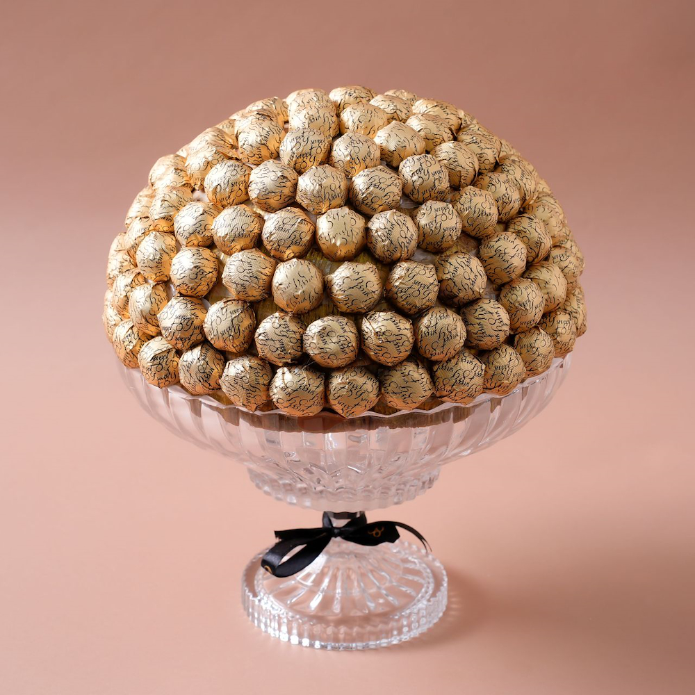 صينية تحتوي على 110 قطعة من الشوكولاتة (1.6 كيلو) بحشوات الكراميل بالبندق والنوتيلا بالبندق.