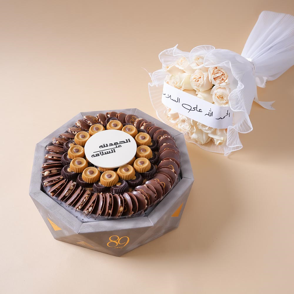 صينية مليئة بأزهار شوكولاتة، بتصميم أنيق، تضم 134 قطعة كوكاو بحشوات نوتيلا هازلنوت، هازلنوت كابتشينو، وكاراميل، بوزن تقريبي 1 كيلو، مع باقة يد أنيقة من أزهار.