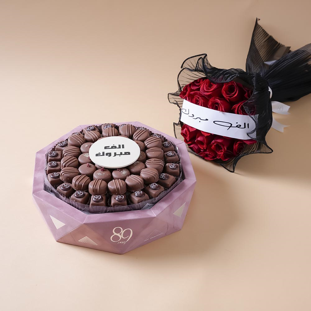 صينية أنيقة تضم 76 قطعة براوني شوكولاتة بحشوات كاراميل، هيل مع زعفران، وبرالين بالكاراميل، بوزن تقريبي 1040غ، مع باقة يد أنيقة من أزهار.