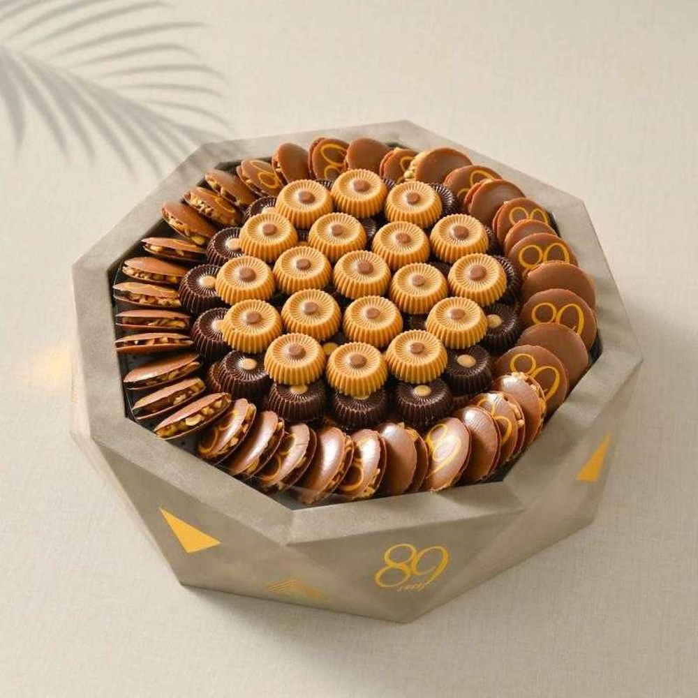 علبة تحتوي على 134 قطعة من حشوات الكاكاو بنكهات نوتيلا بالبندق، كابتشينو بالبندق، وكاراميل، بوزن يقارب 1 كيلو.