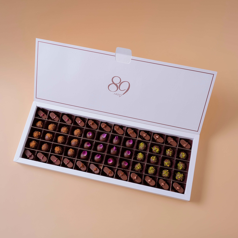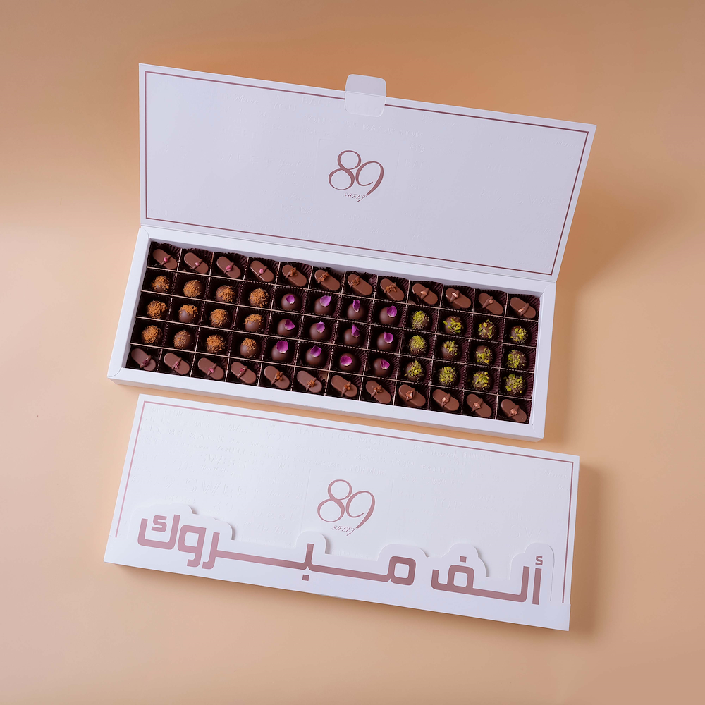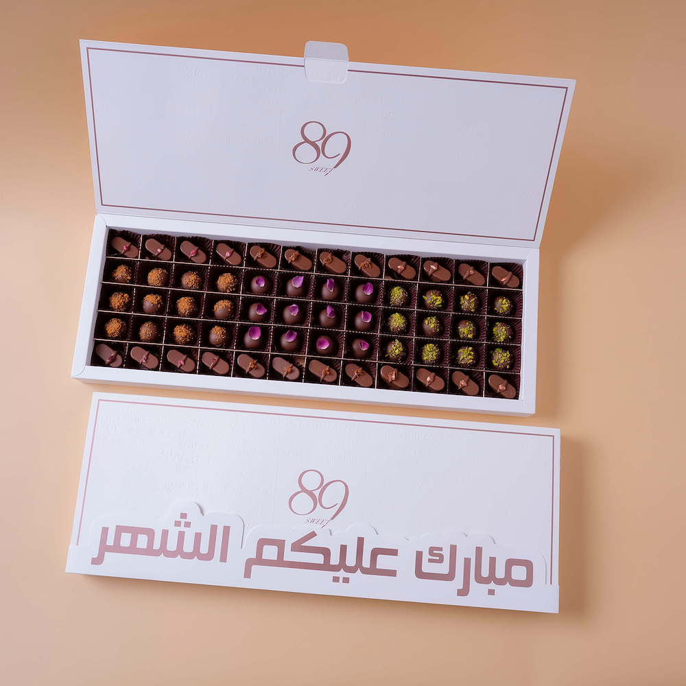 بوكس يحتوي على 60 قطعة حلويات، ويتميز بحشوات الفستق، اللوتس، النوتيلا، القهوة، الكراميل، والتشيزكيك.