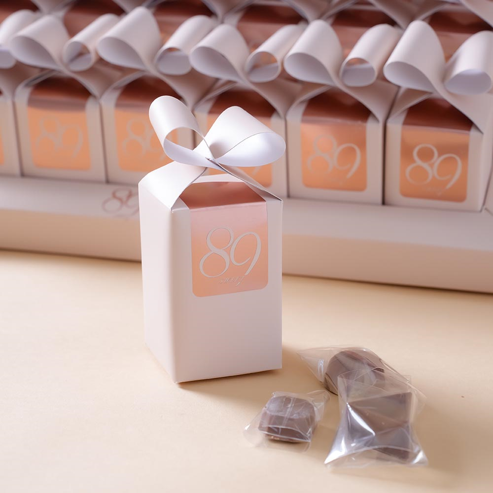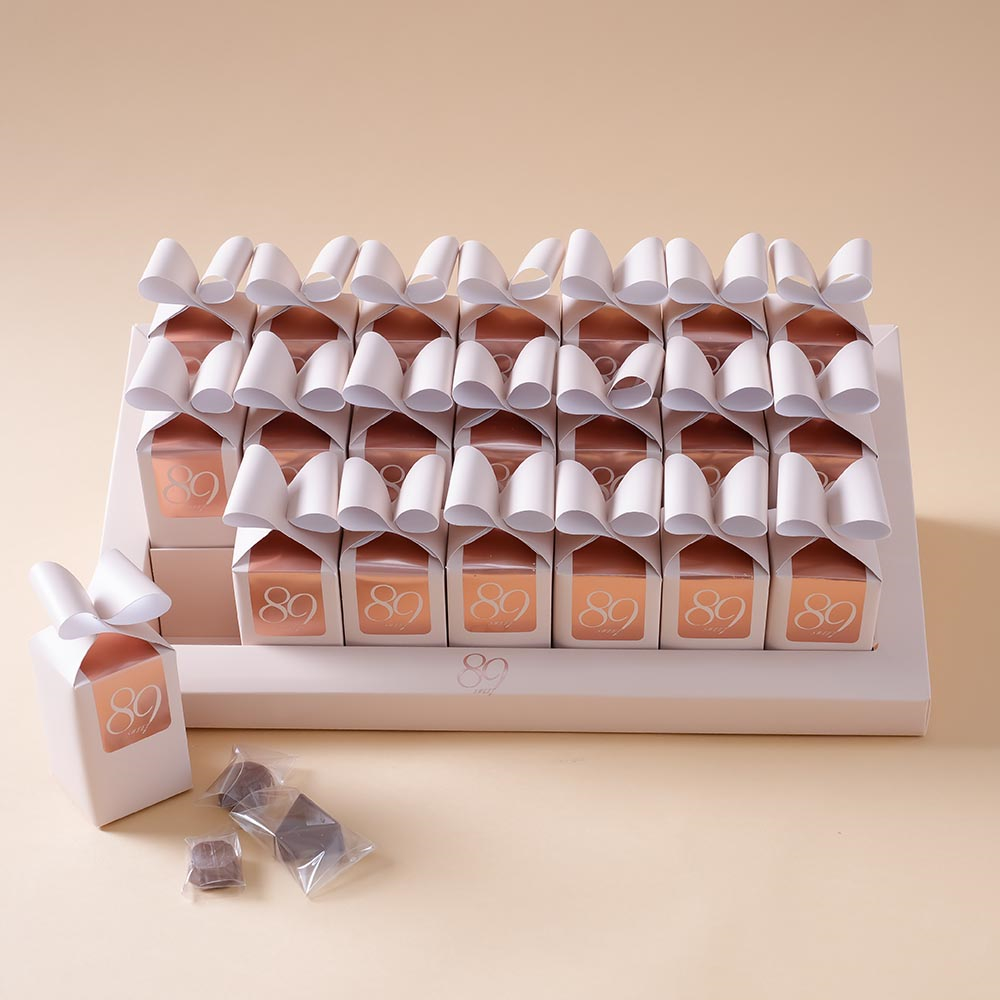 مجموعة انيقة من 21 بوكسات صغيرة للتوزيعات، كل بوكس تضم 63 قطعة شوكولاتة بحشوات توفي كاراميل، هازلنوت بارلينوسا،وهازلنوت رويال فودج.
