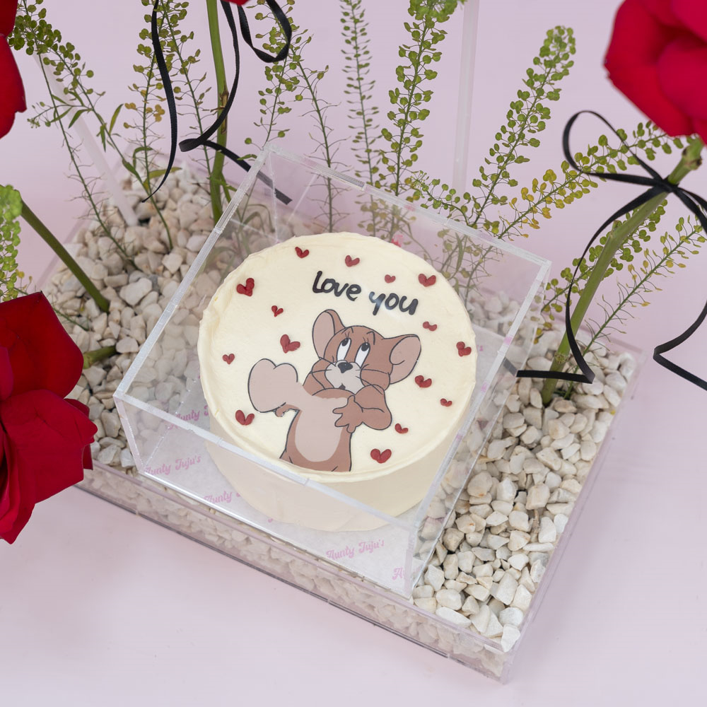 صينية أكريليك مزينة بزهور الجوري وبالونتين مع كيكة شوكولاتة بينتو بحجم 4 إنش.