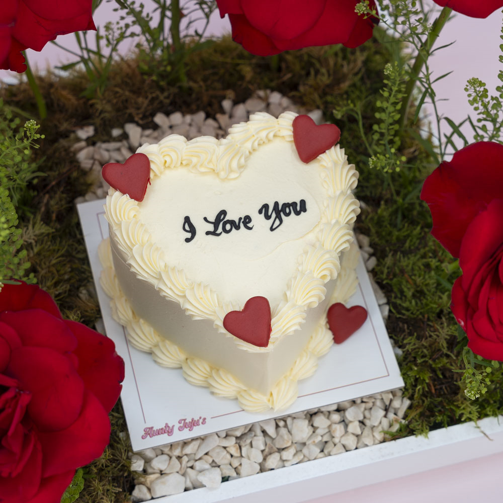 صينية أكريليك مزينة بأزهار الجوري مع كيكة شوكولاتة بقياس 5 انش.