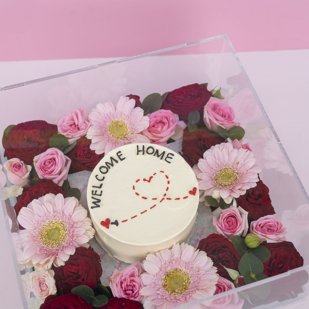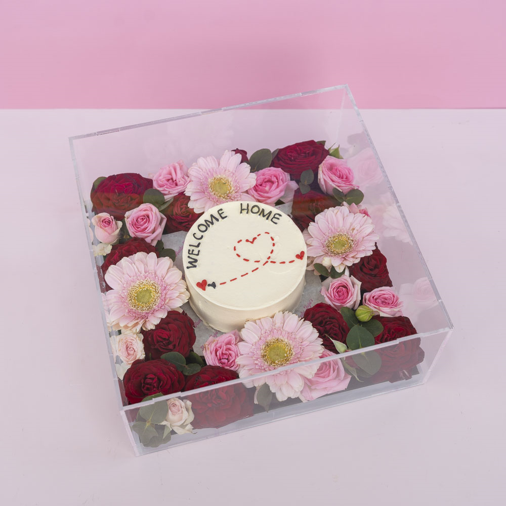 صينية أكريليك تحتوي على كيكة بينتو الشوكولاتة بقياس 4-انش، مزينة بمزيج من الزهور.