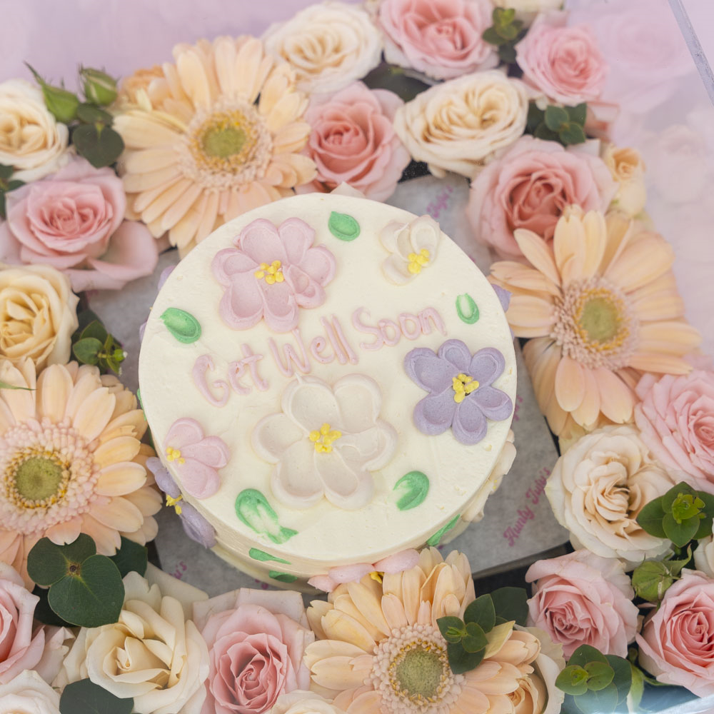 صينية أكريليك تحتوي على كيكة بينتو الشوكولاتة بقياس 4-انش، مزينة بمزيج من الزهور.