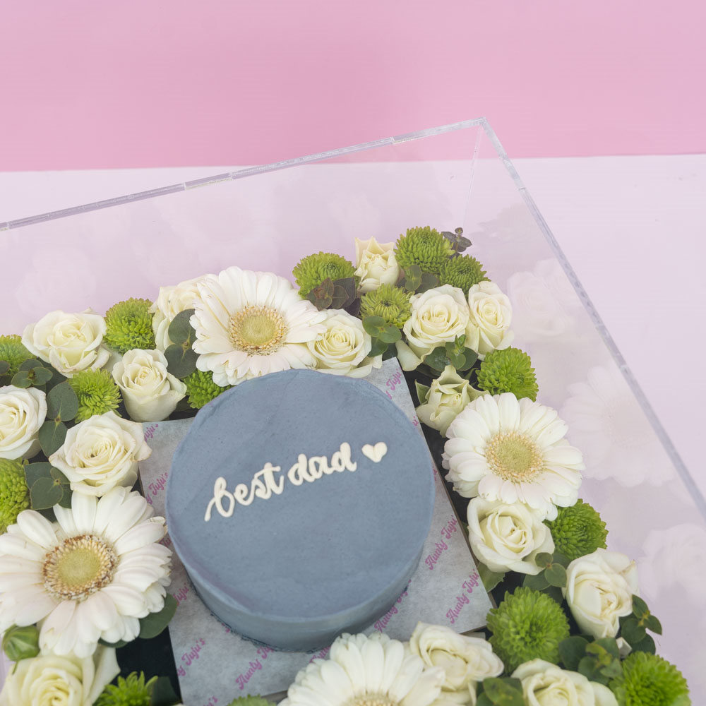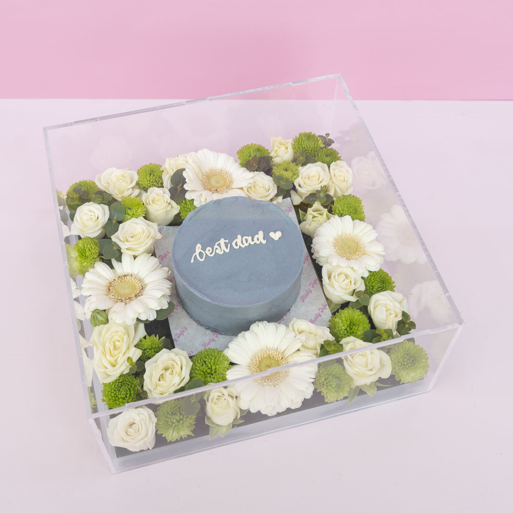 صينية أكريليك تحتوي على كيكة بينتو الشوكولاتة بقياس 4-انش، مزينة بمزيج من الزهور.